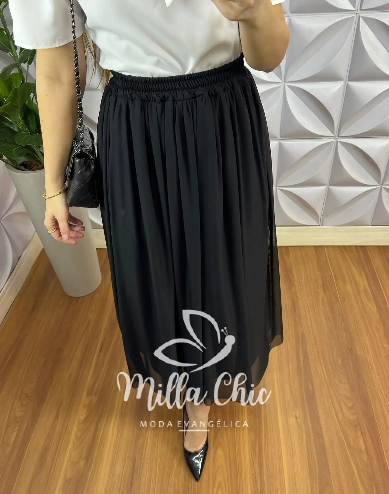 Saia Tule Longa com Lastex na Cintura Adriele - Preto - Milla Chic