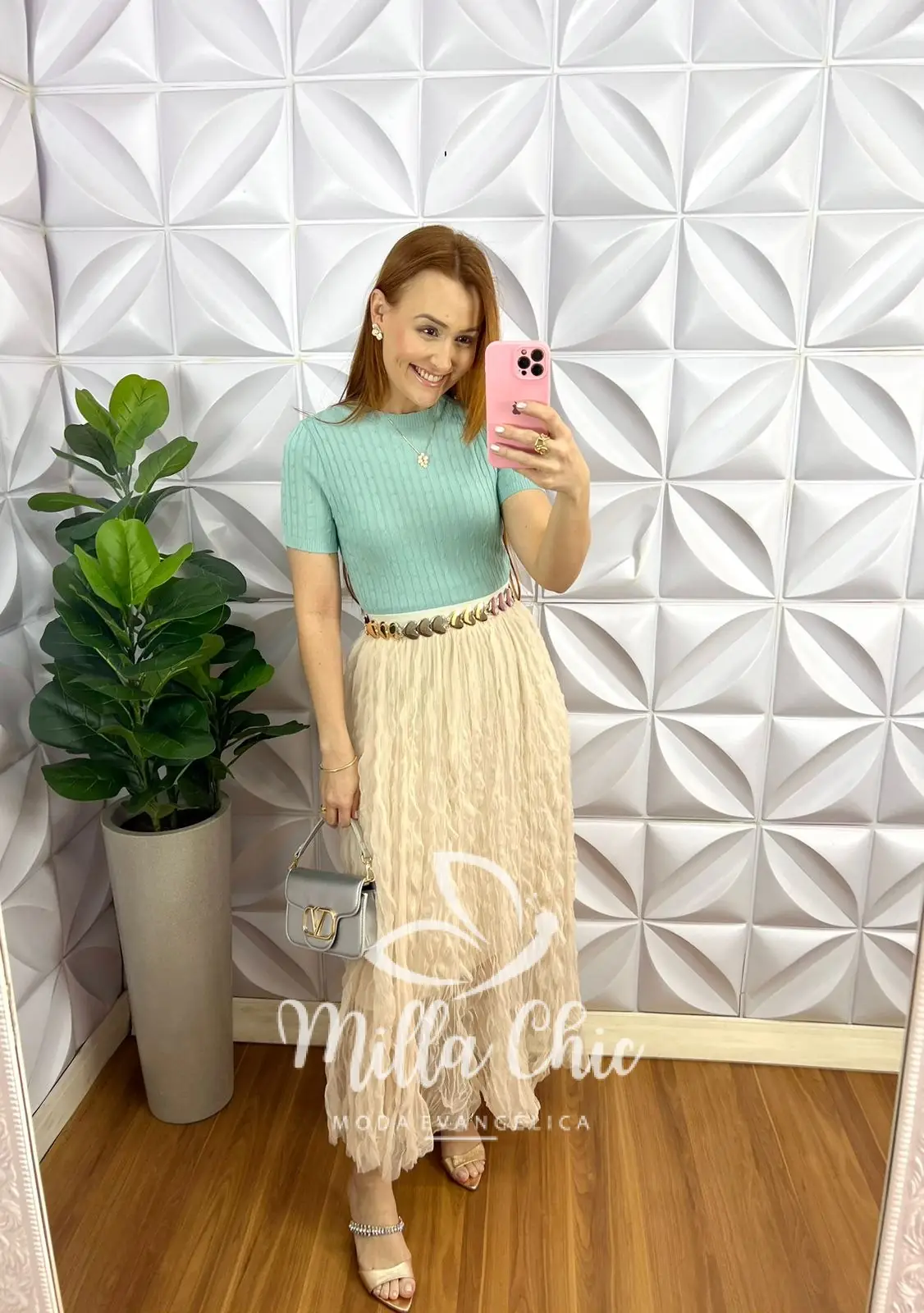 Saia Tule Marcado Mídi Com Elástico na Cintura Kerolen - Areia - Milla Chic