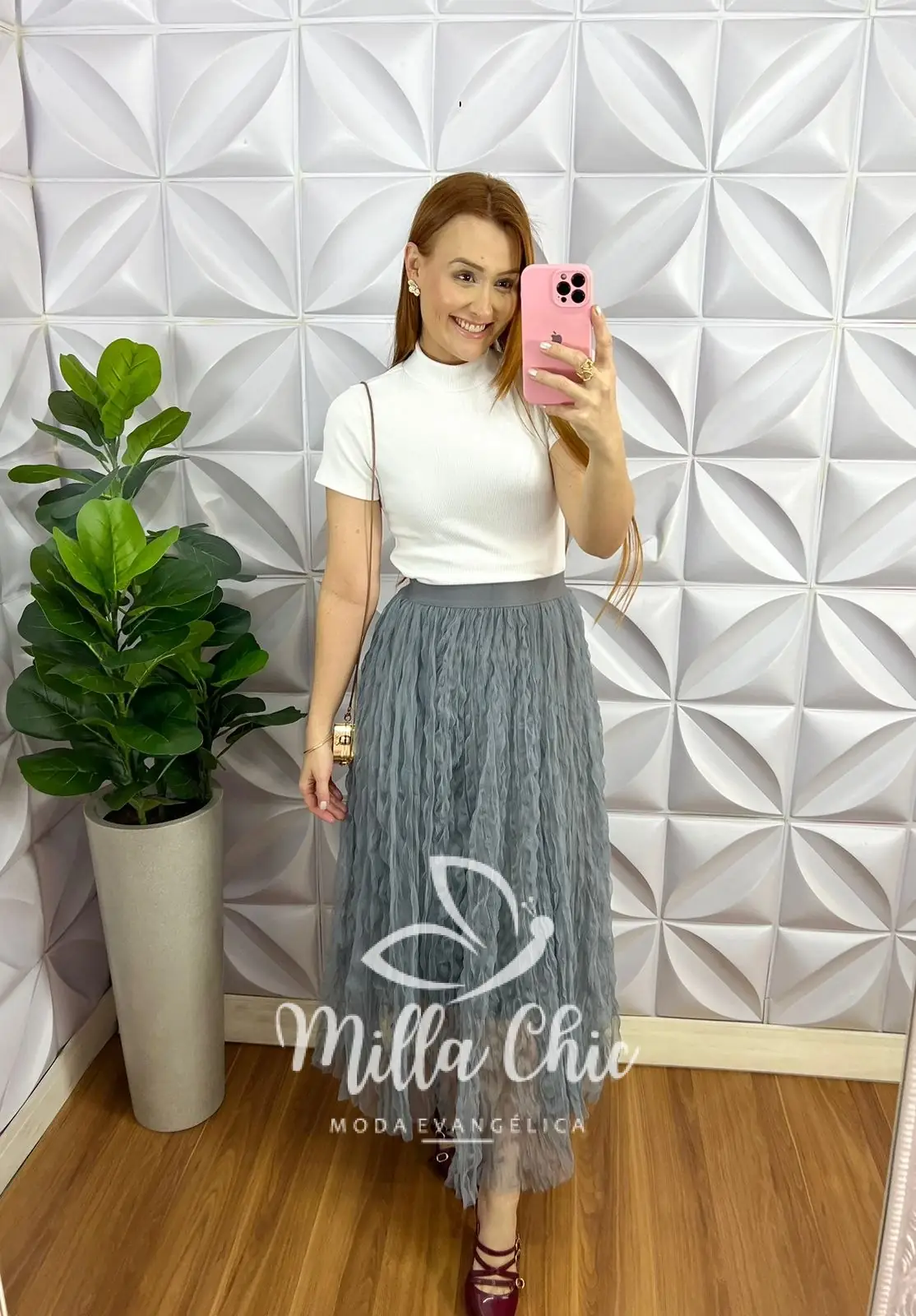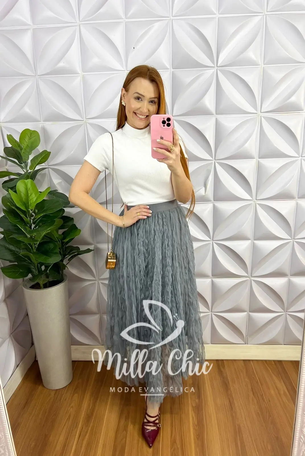 Saia Tule Marcado Mídi Com Elástico na Cintura Kerolen - Cinza - Milla Chic