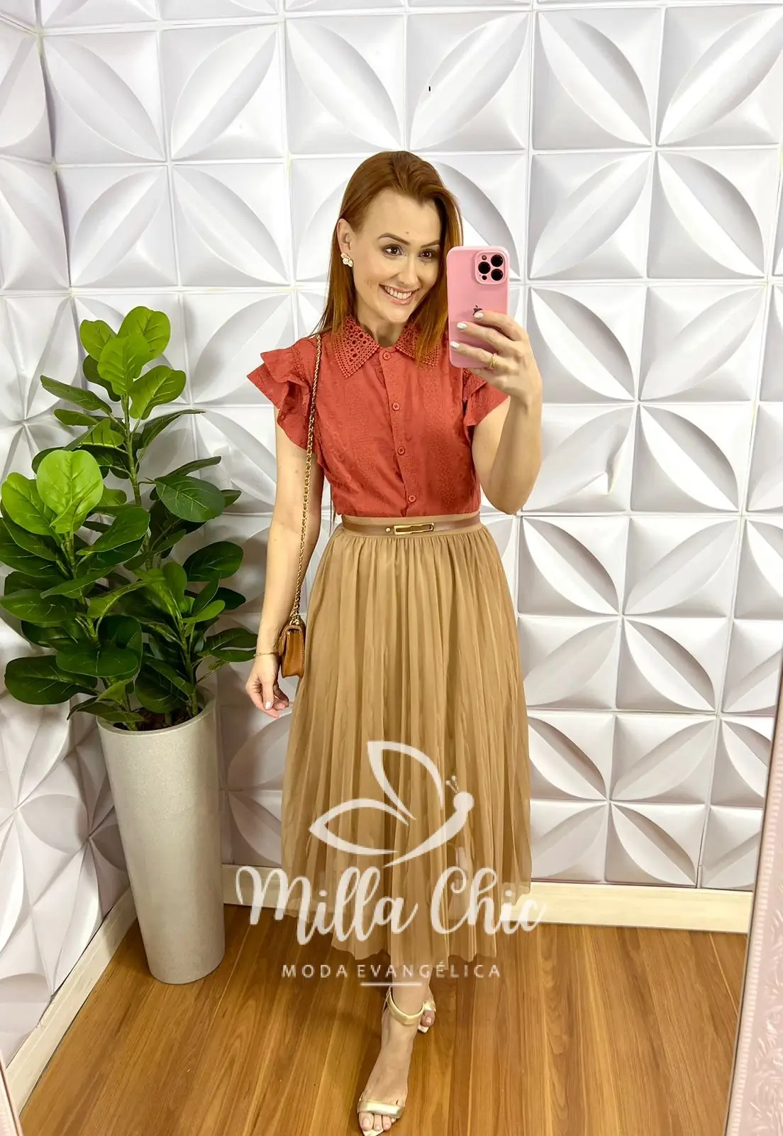 Saia Tule Mídi Com Elástico na Cintura Sabrine - Areia - Milla Chic