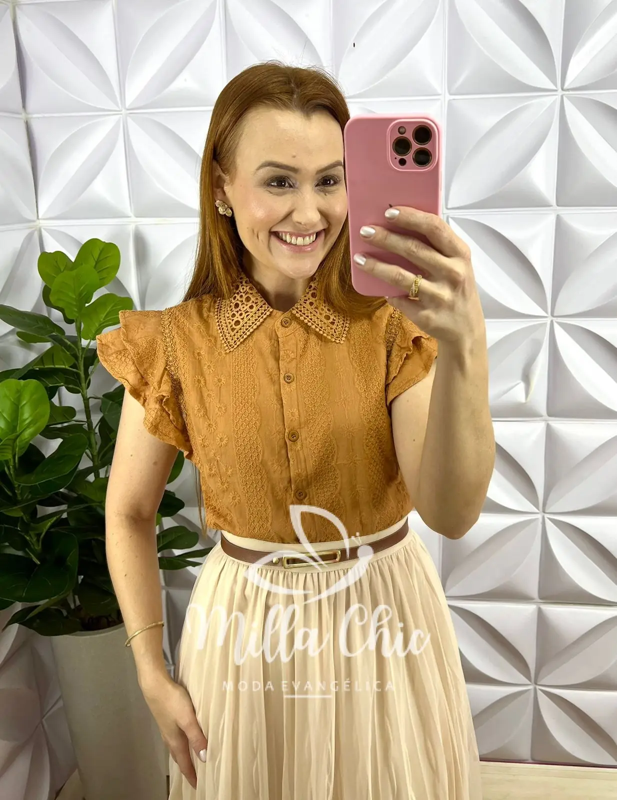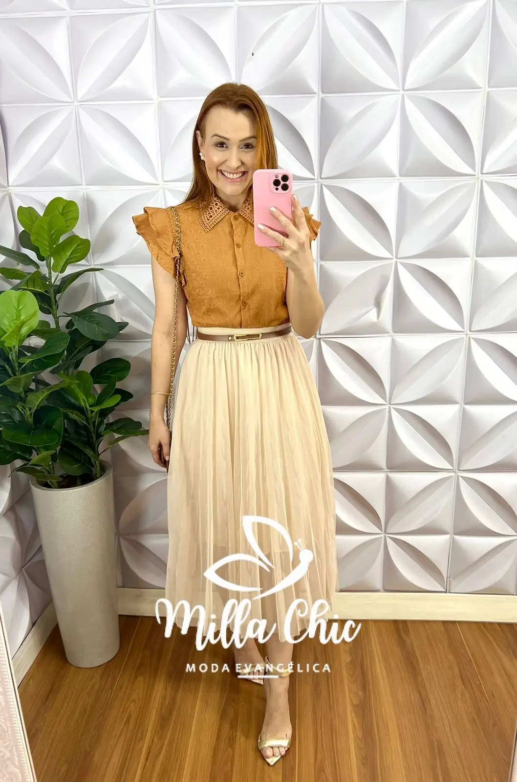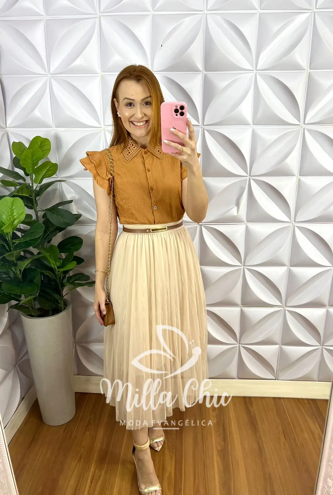 Saia Tule Mídi Com Elástico na Cintura Sabrine - Manteiga - Milla Chic