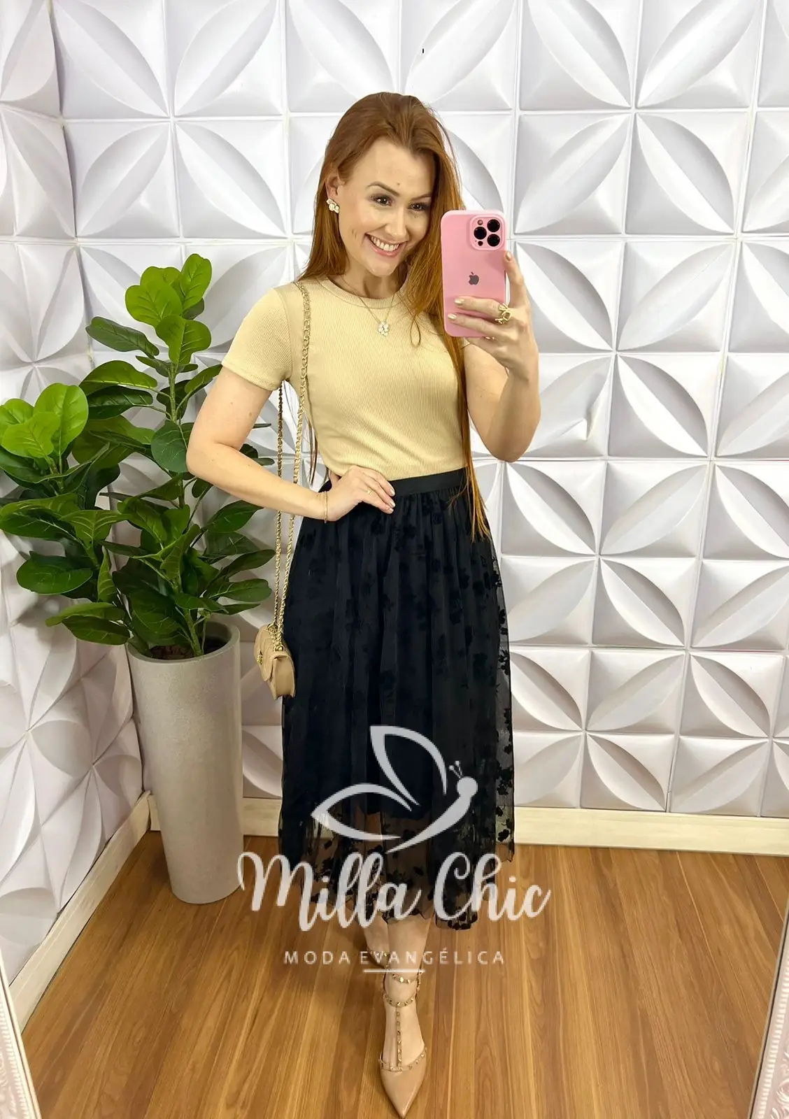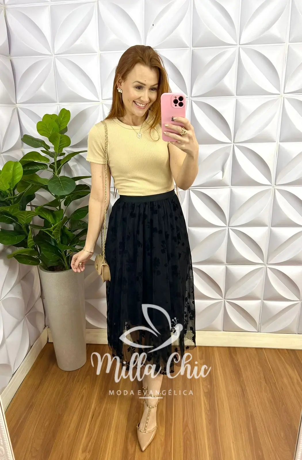 Saia Tule Mídi Com Flores Bordadas Isabella - Preta - Milla Chic