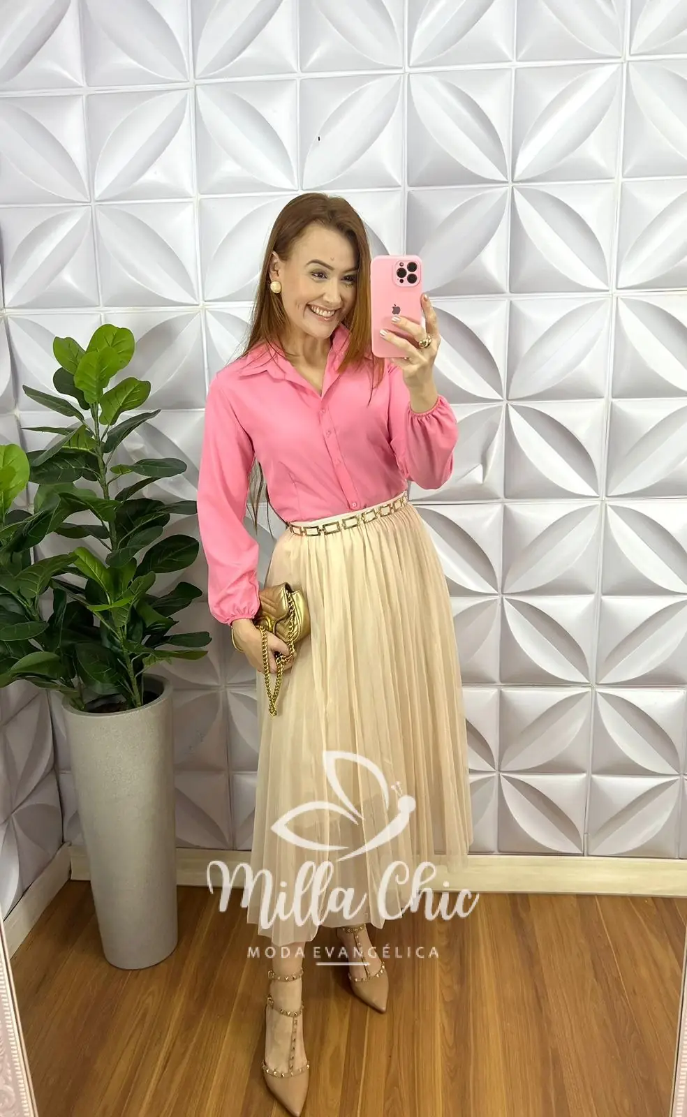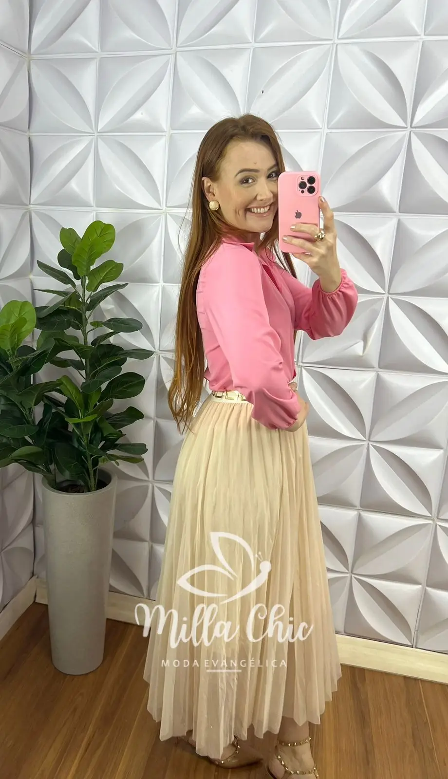 Saia Tule Midi Estilo Plissado Toda Forrada Sophia - Areia - Milla Chic