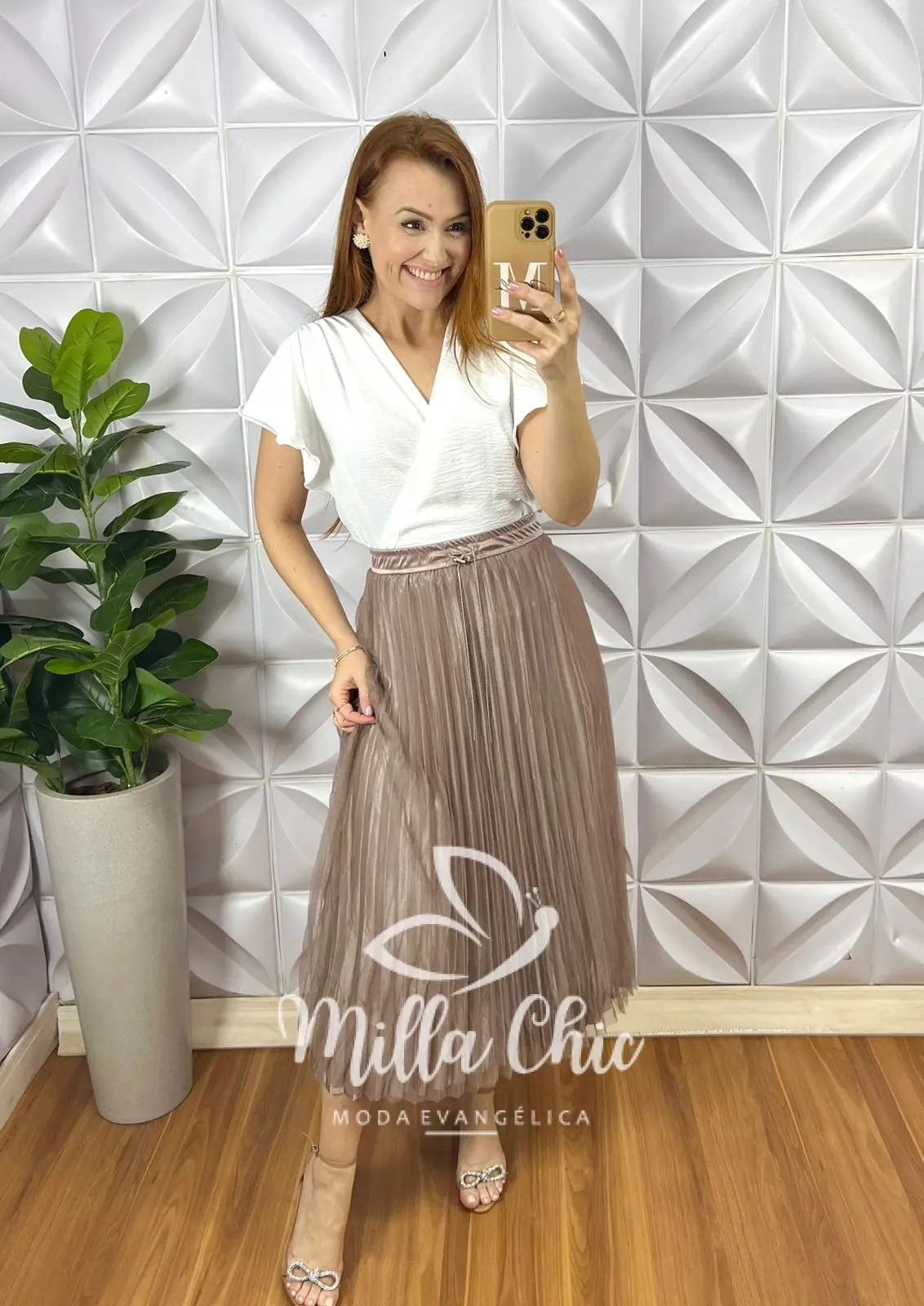 Saia Tule Super Mídi Plissada Toda Forrada Com Regulagem Na Cintura Sophia – Mousse