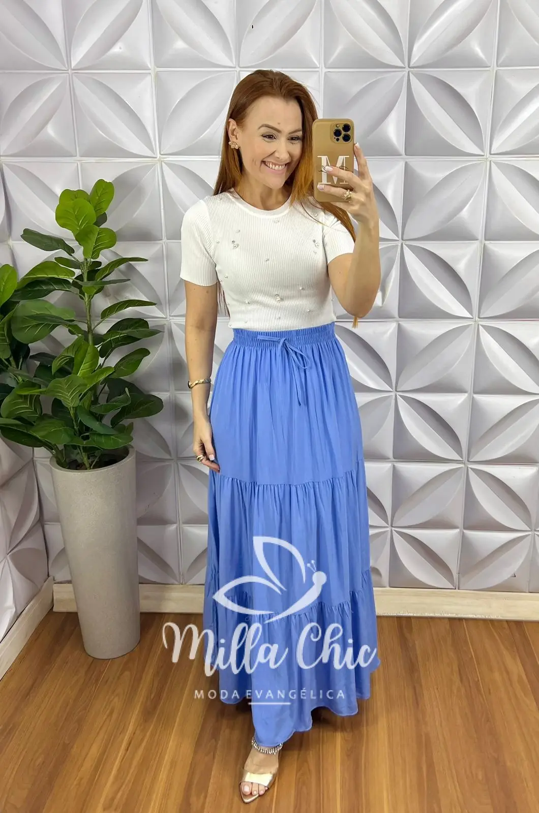 Saia Viscose Com Lastex Na Cintura Longa Três Marias Quitéria - Azul - Milla Chic