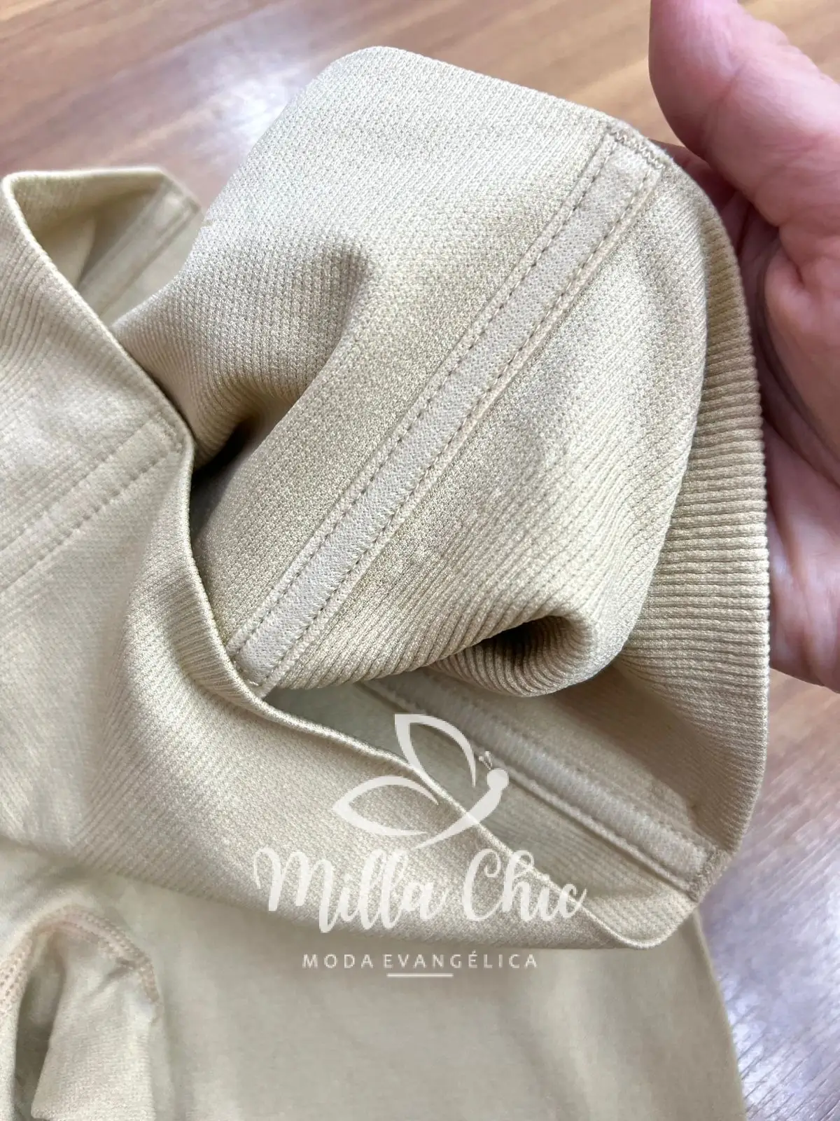 É confeccionada em tecido poliamida com elastano que garante alta compressão, além de reforço em tecido na região do abdômen e faixas que levantam os glúteos.