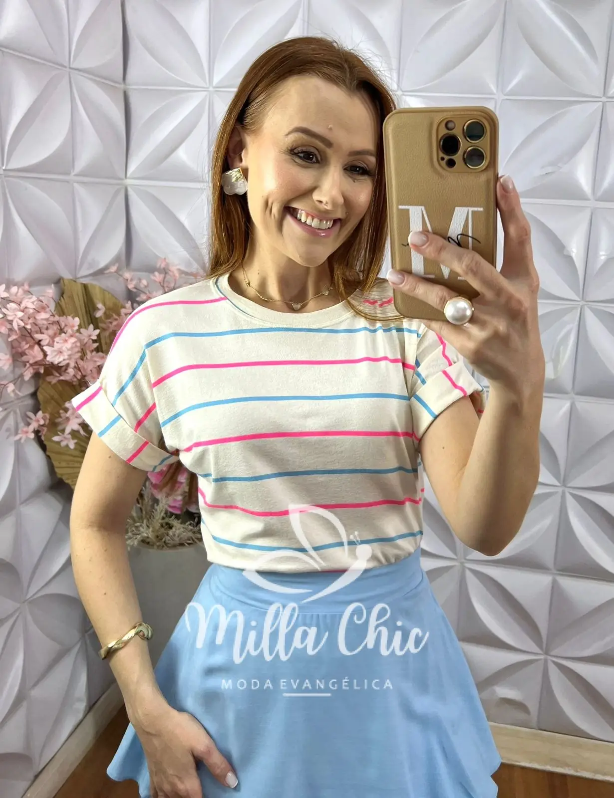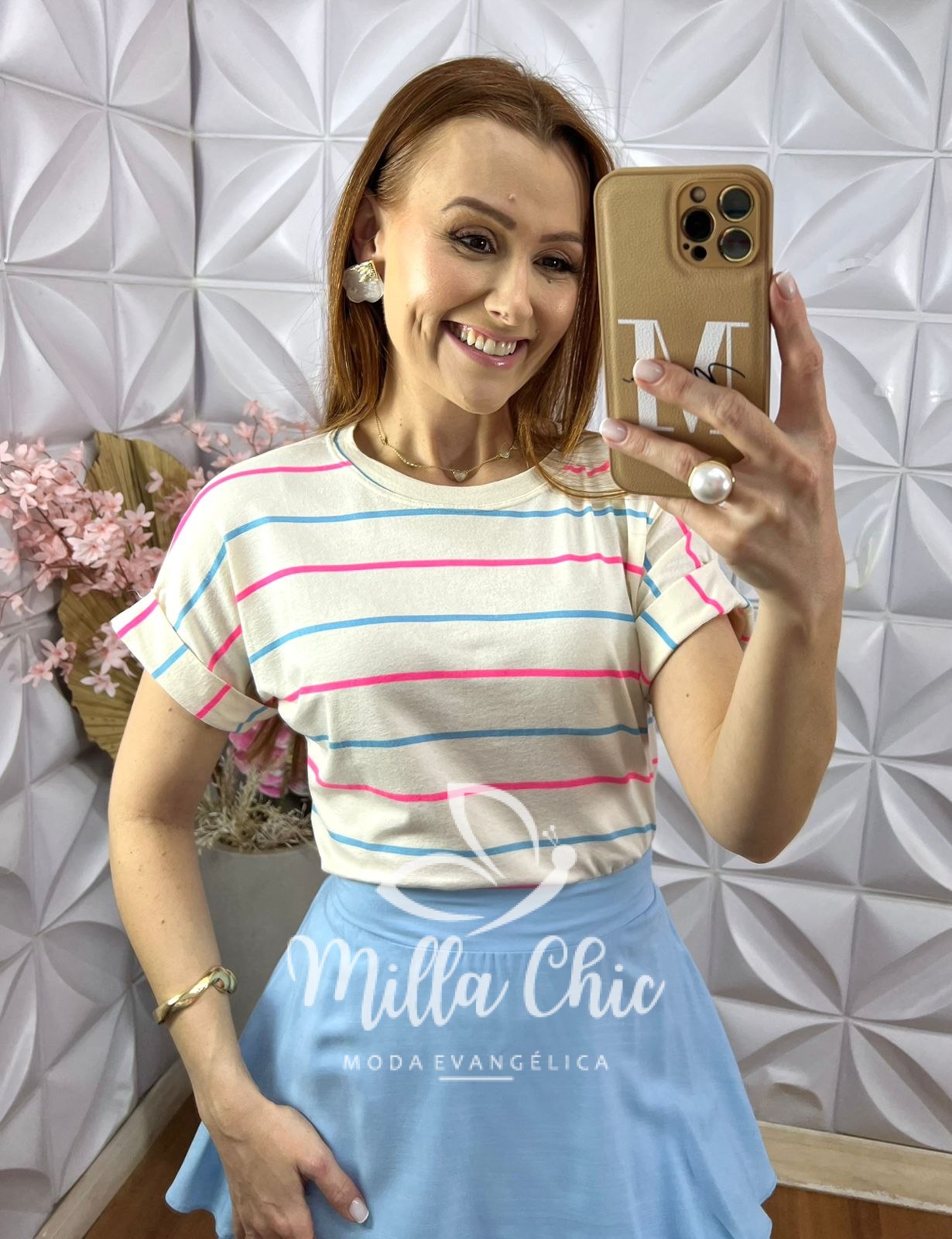 Esse modelo tem a manga dobradinha que traz muito estilo e as listras em cores dando muito charme.