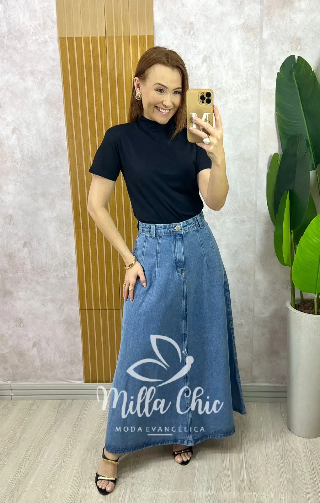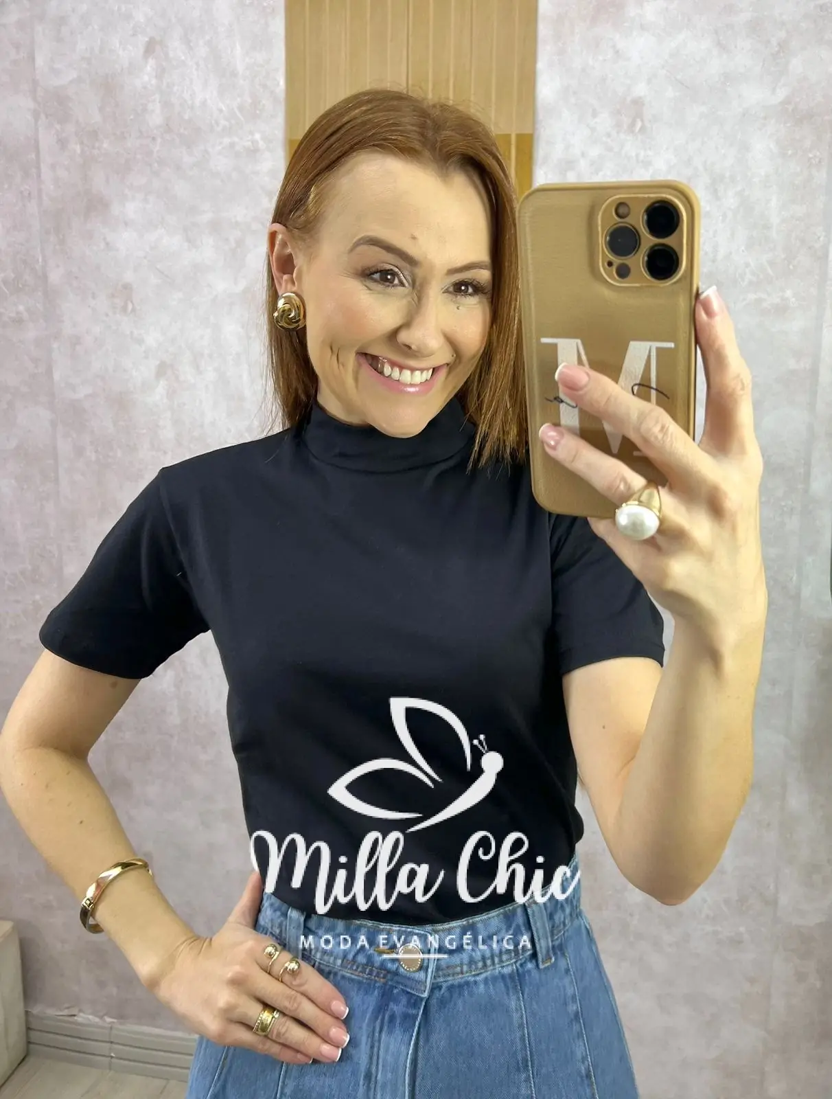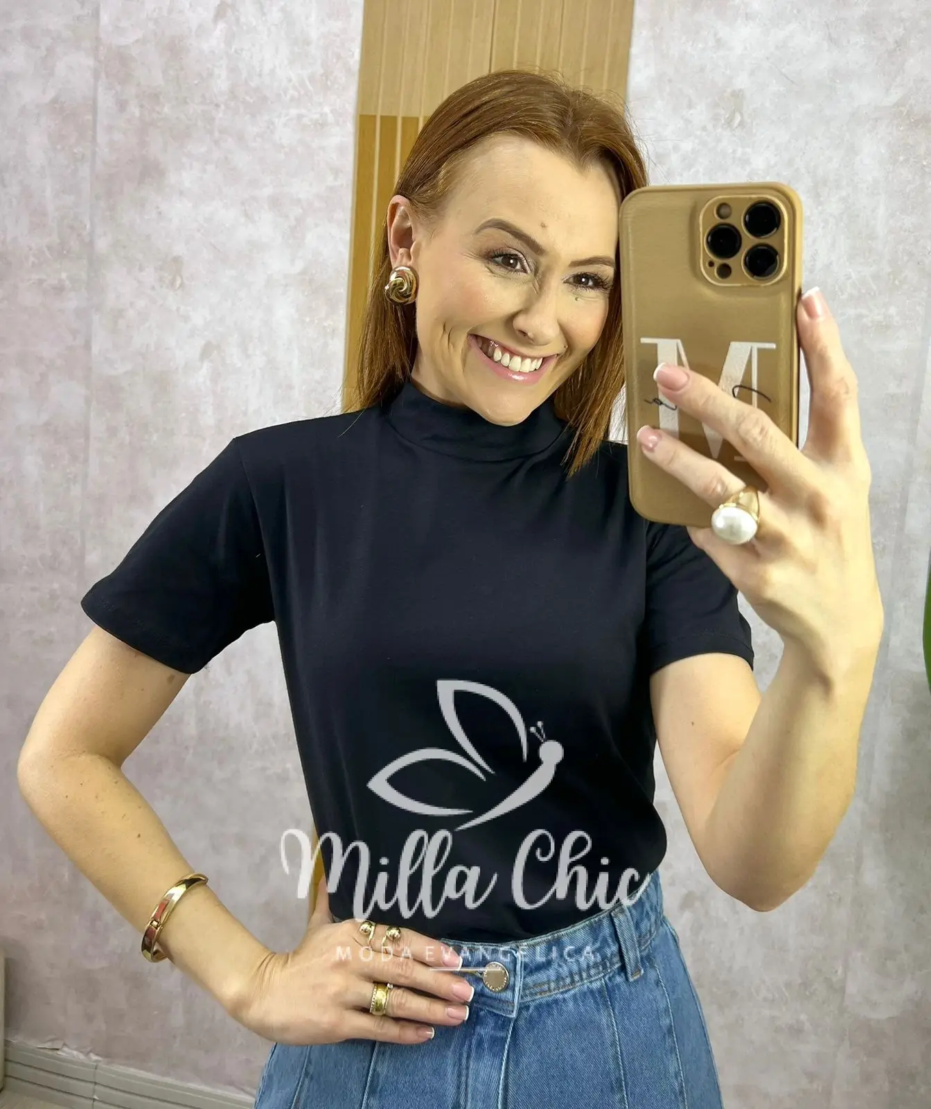 Ela possui uma modelagem reta e a gola alta que passa uma elegância e alonga .