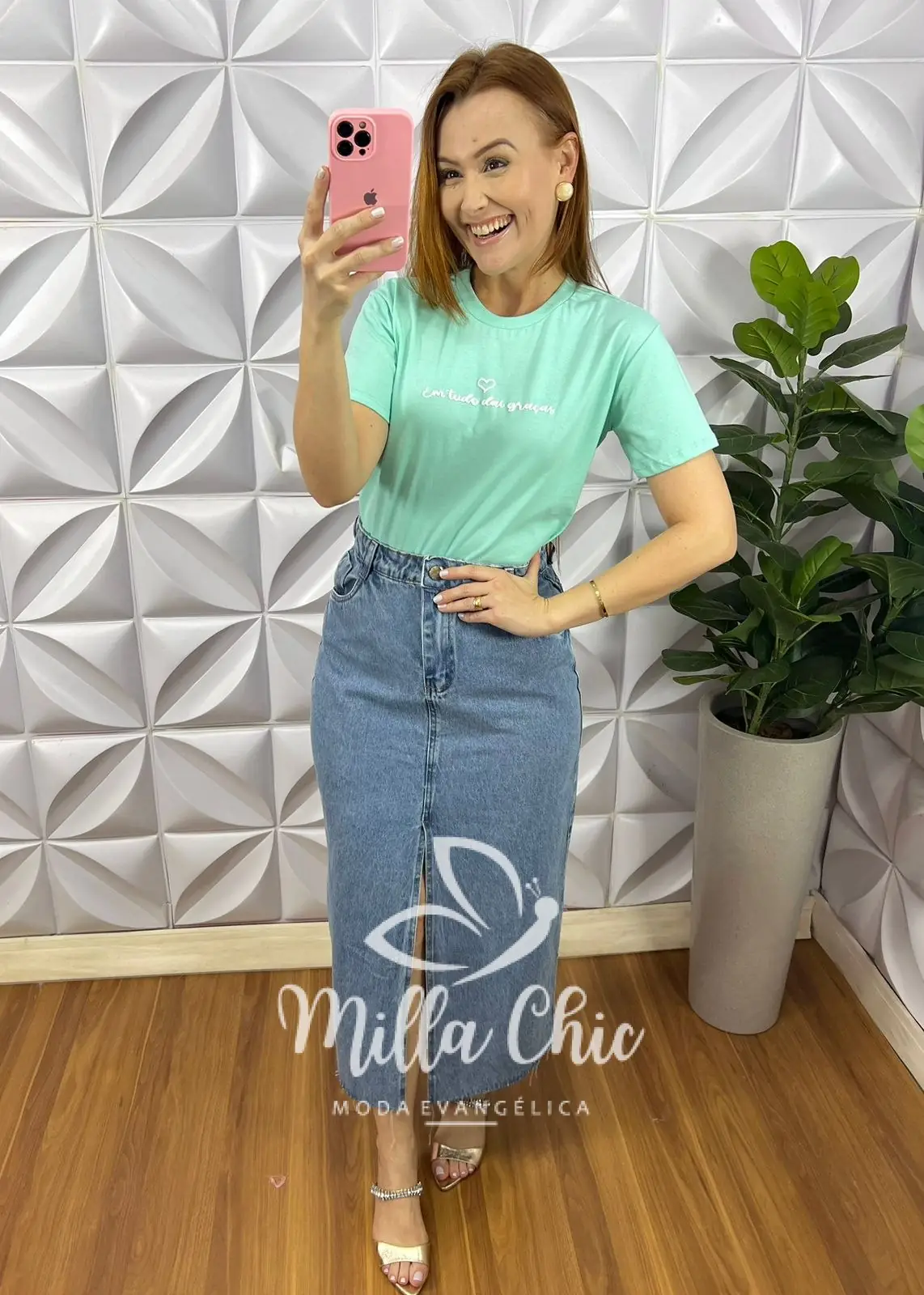 Tshirt De Malha de Algodão Com Frase Silcada Graça – Verde Agua