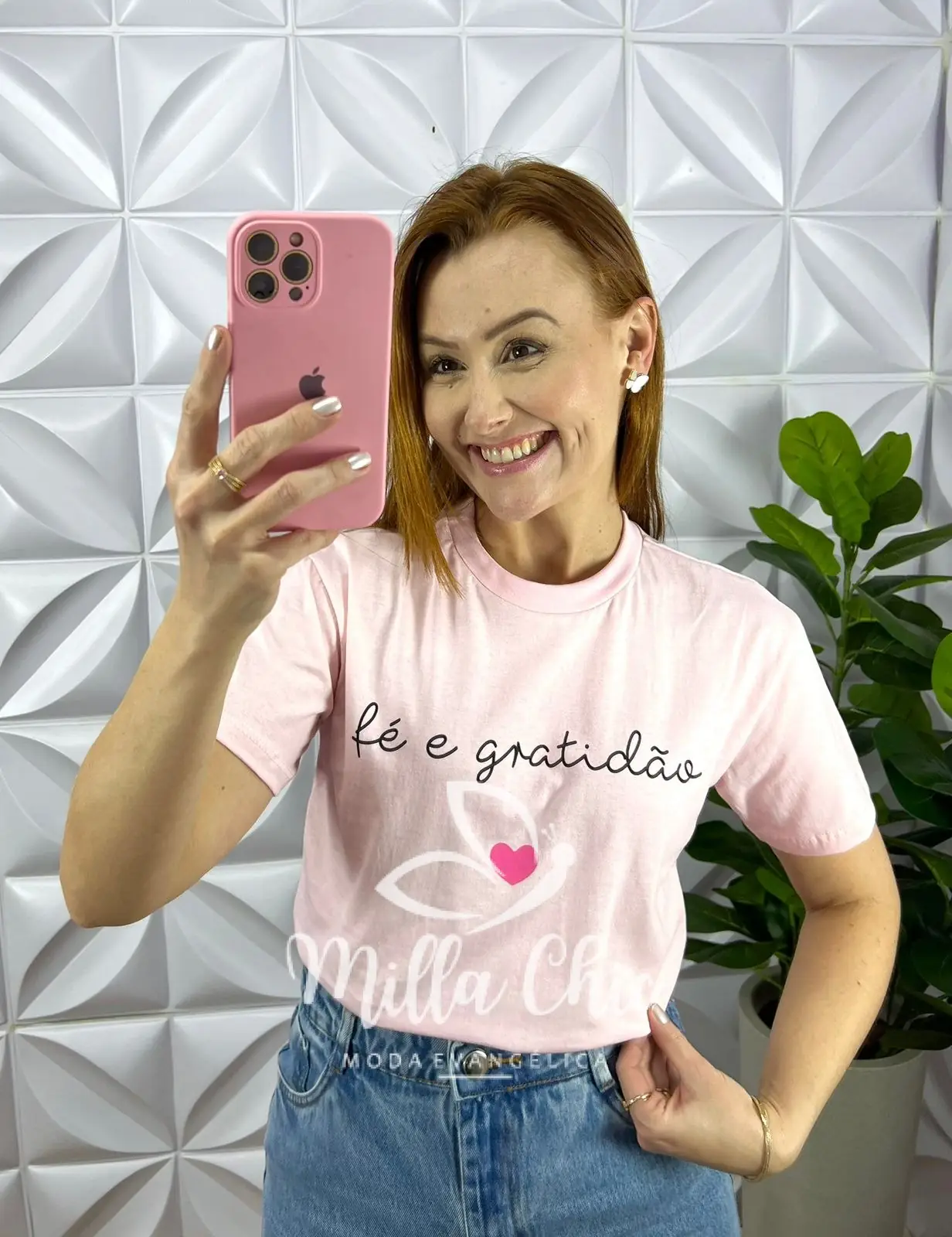 Tshirt lançamento toda no malha de algodão tecido incrível! Possui Frase Silcada ” Fe e Gratidão” que esta um charme!