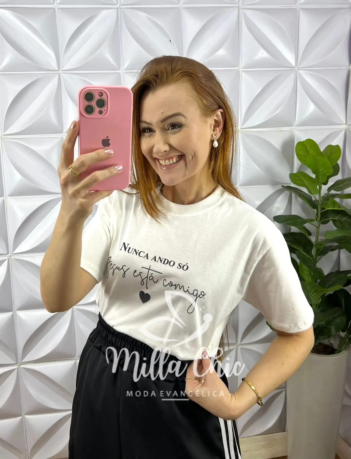 Tshirt lançamento toda no malha de algodão tecido incrível! Possui Frase Silcada ” Nunca ando so Deus esta comigo” que esta um charme!