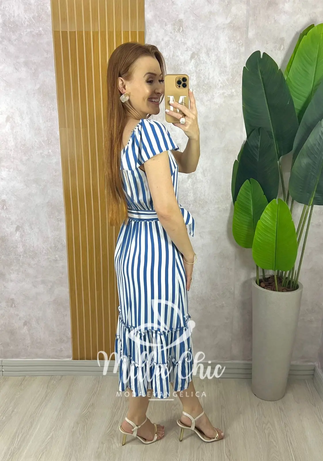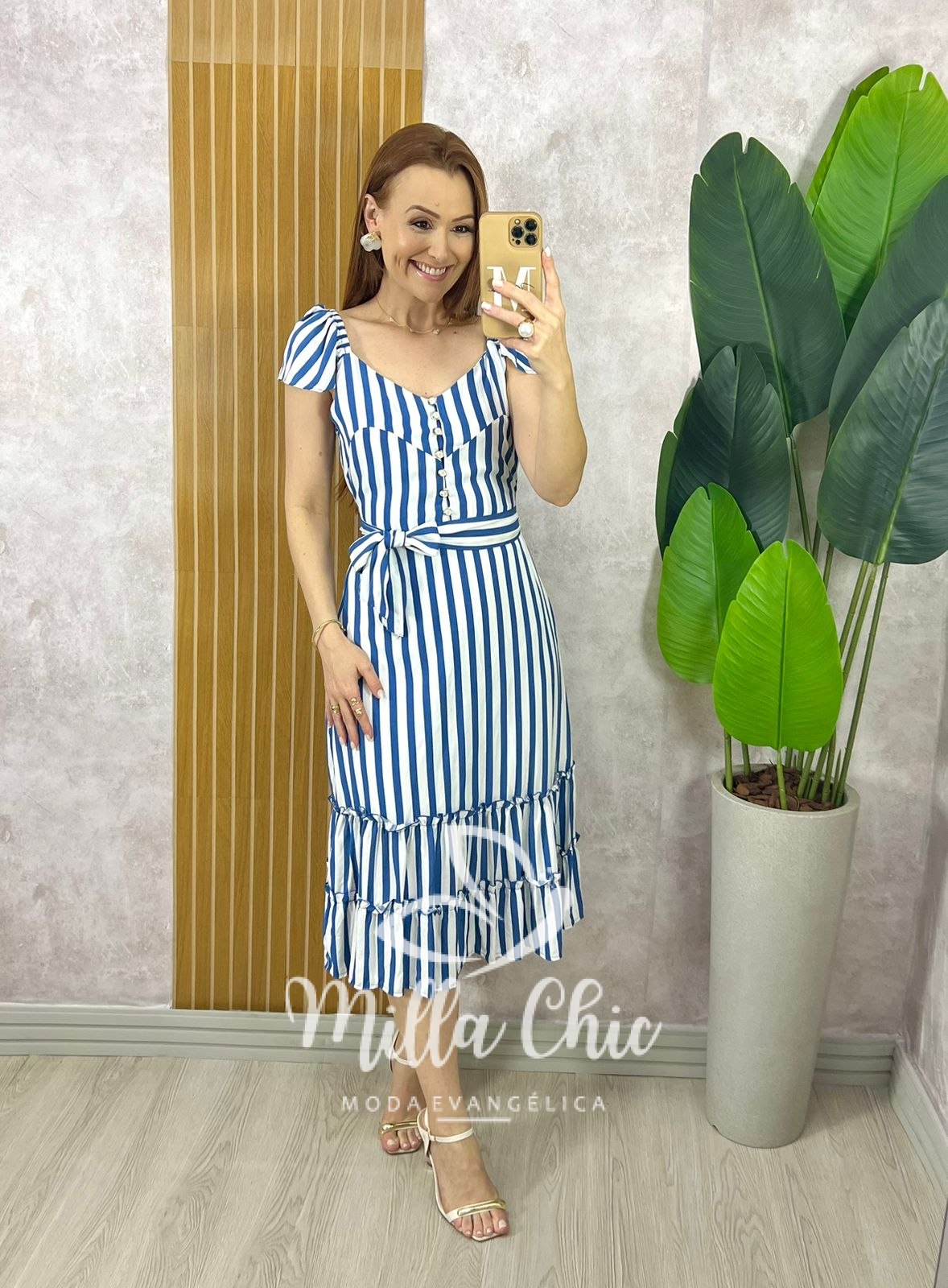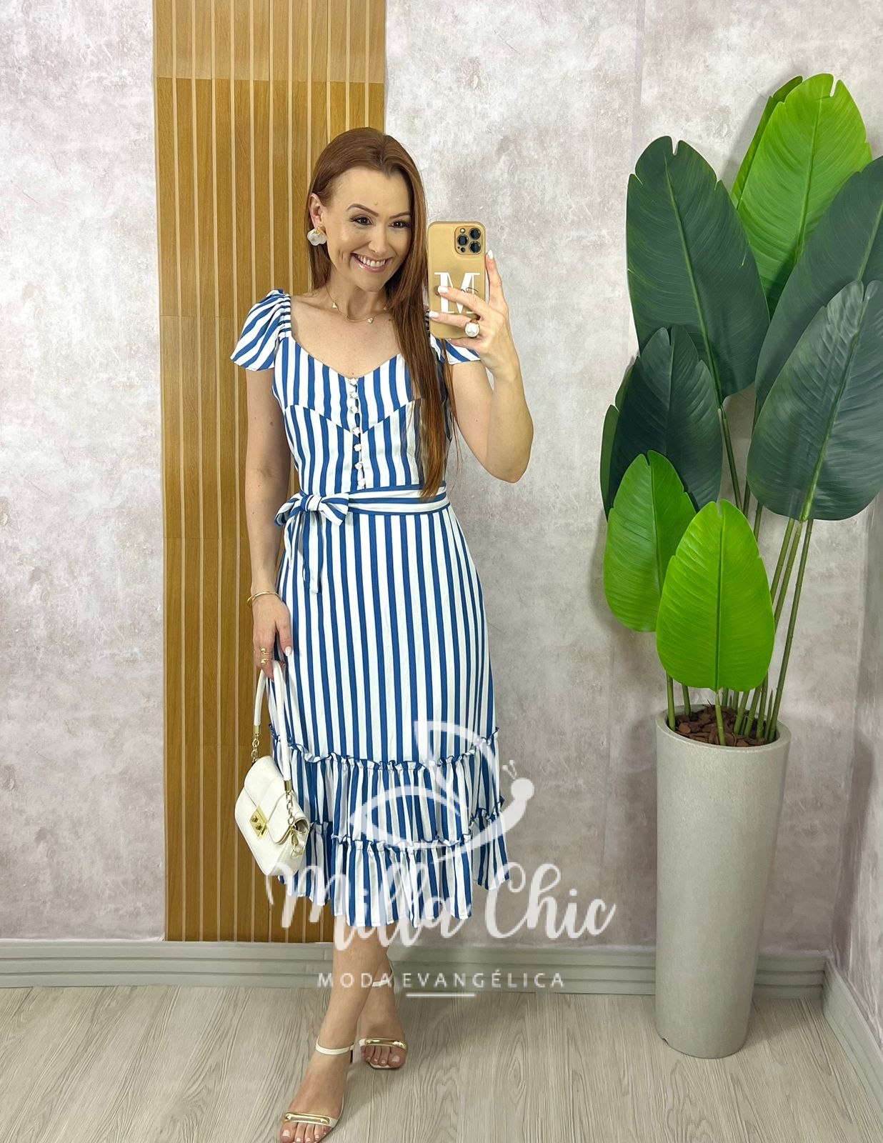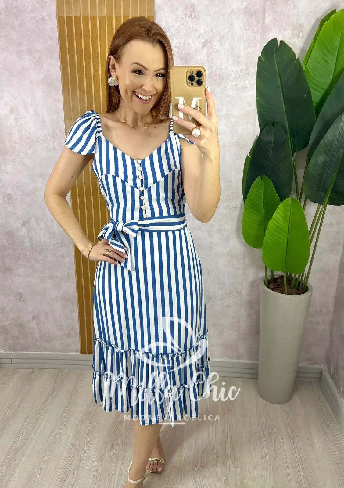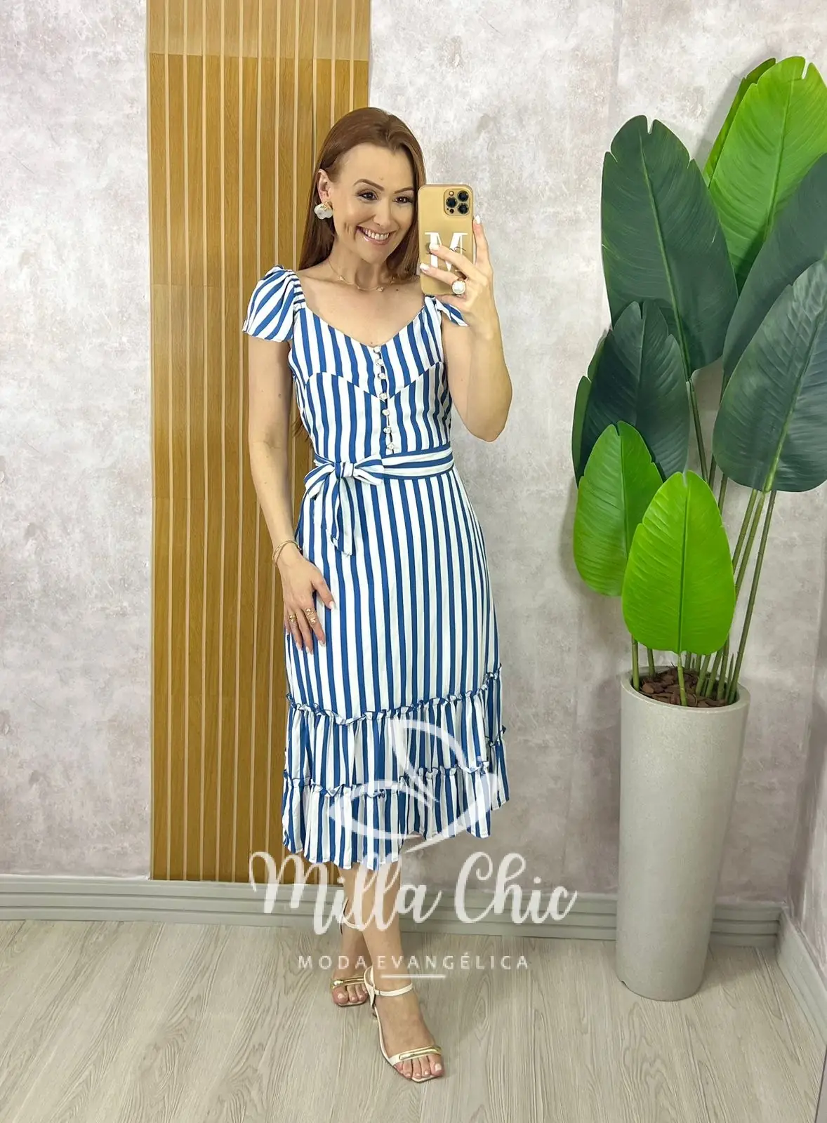 O vestido Abigail é na cor azul naval. Ele é elegante e bem verão que transmite alegria, elegância e autenticidade. Clássico e atemporal . Uma peça indispensável no guarda roupas . Ele apresenta um design midi com elastex na cintura botões perolados funcionais. Acompanha cinto faixa para dar aquela toque especial .