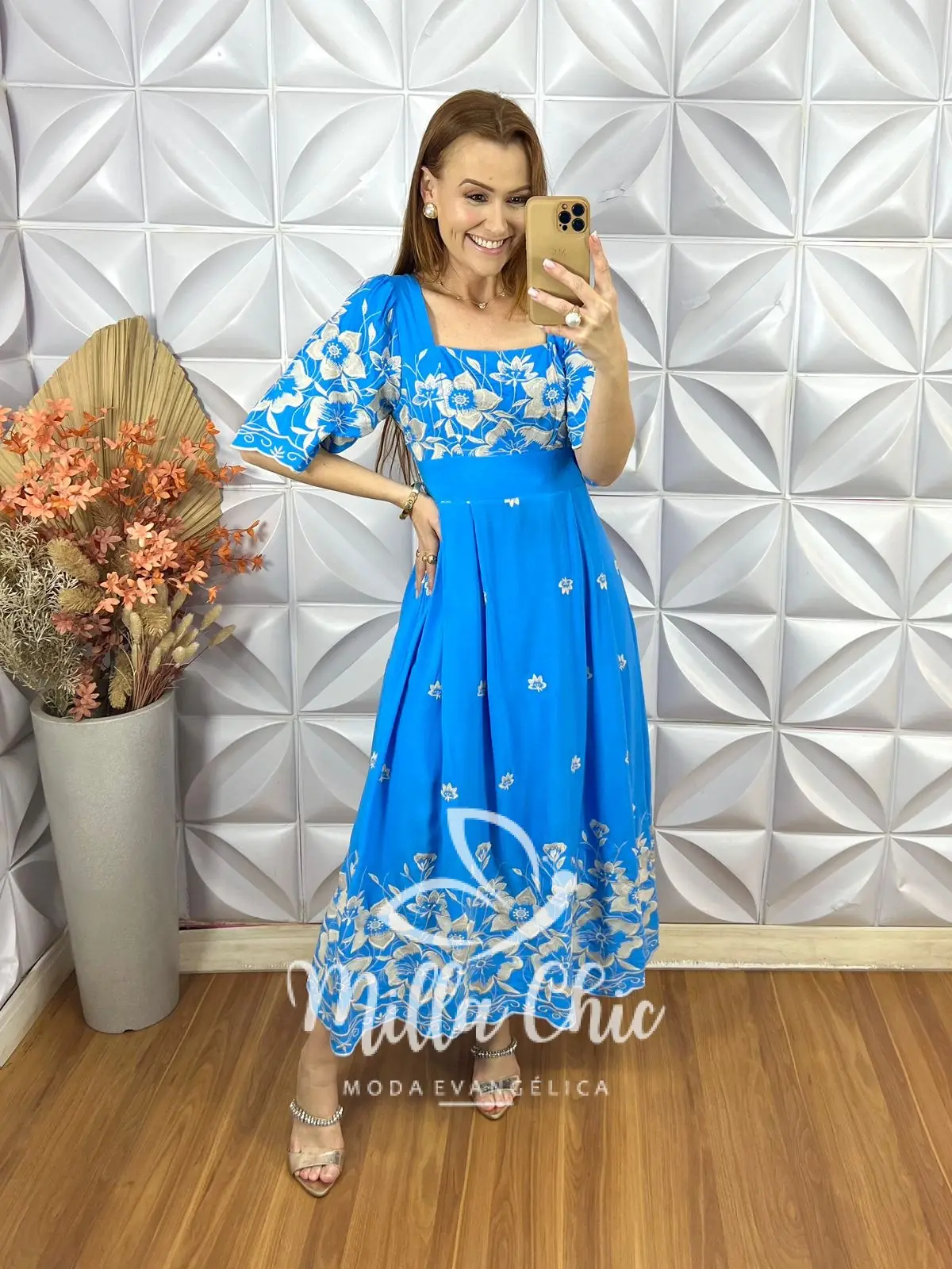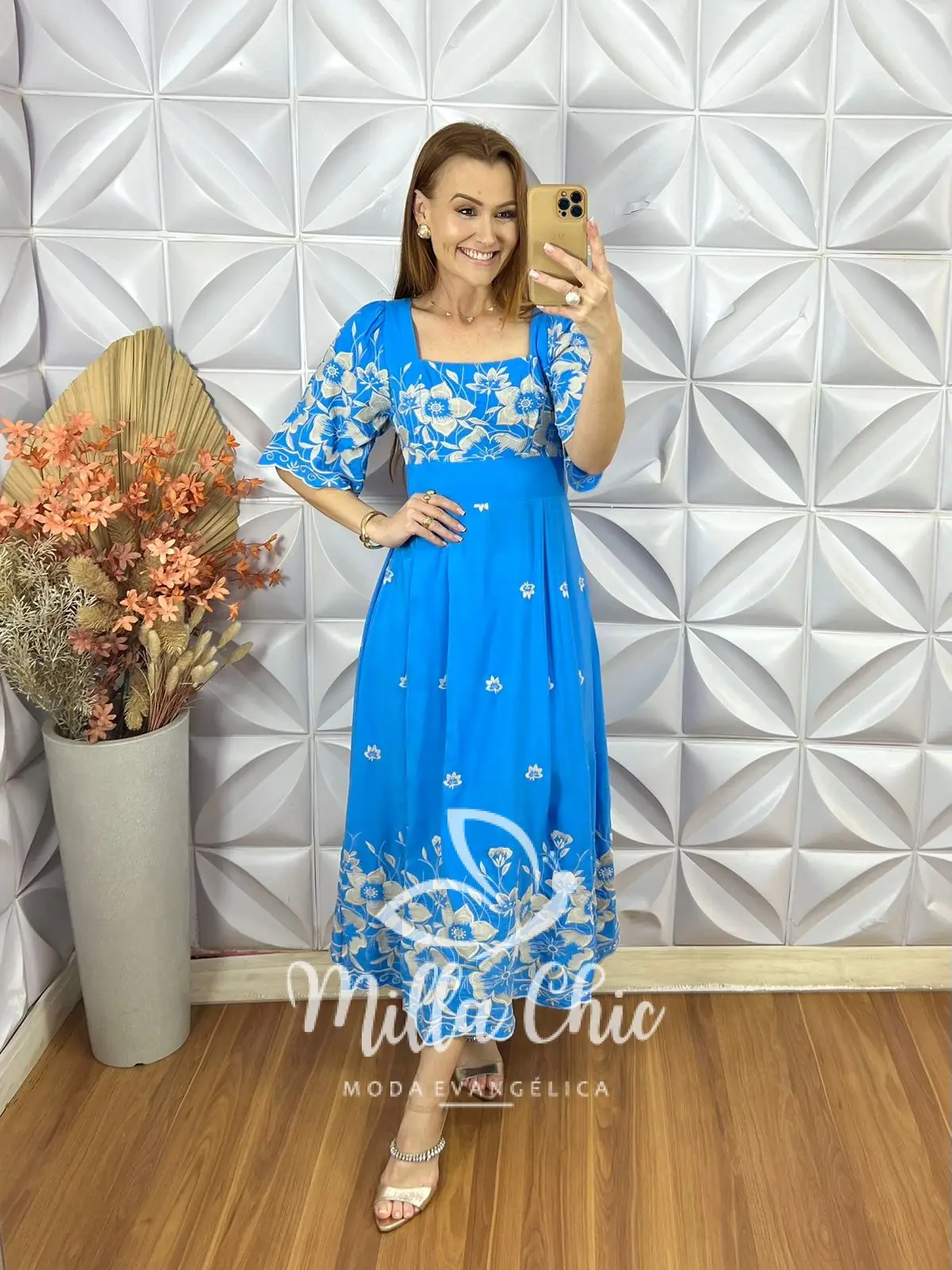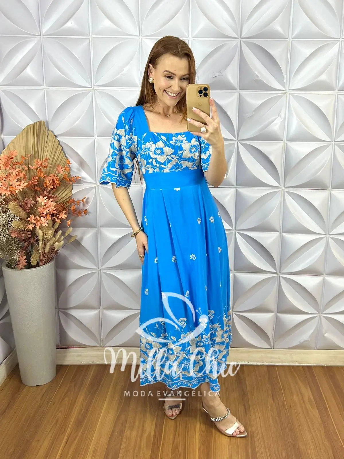 O decote quadrado e a manga raglan fizeram o contraste perfeito com os bordados do vestido dando aquele toque mais elegante.