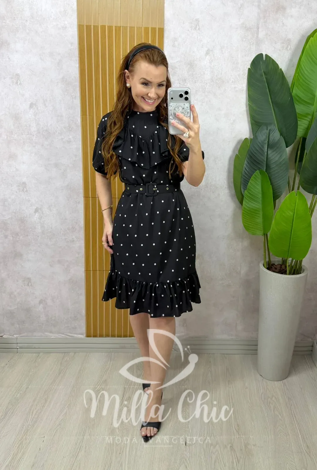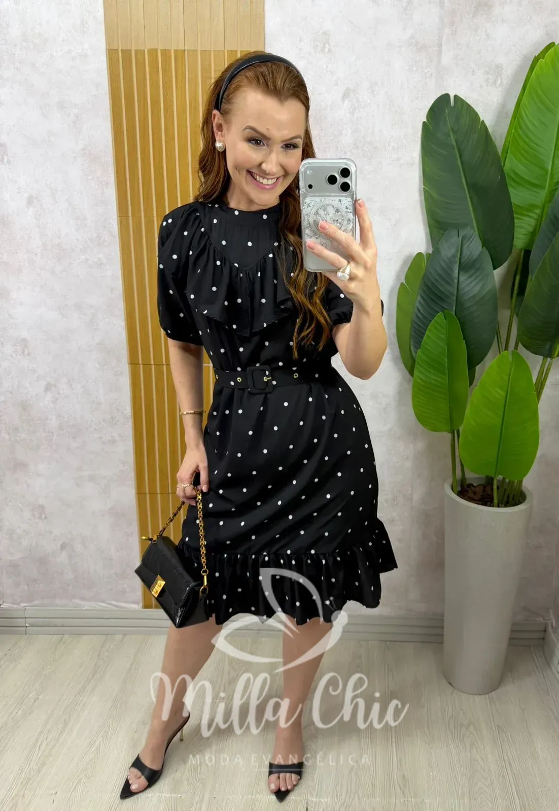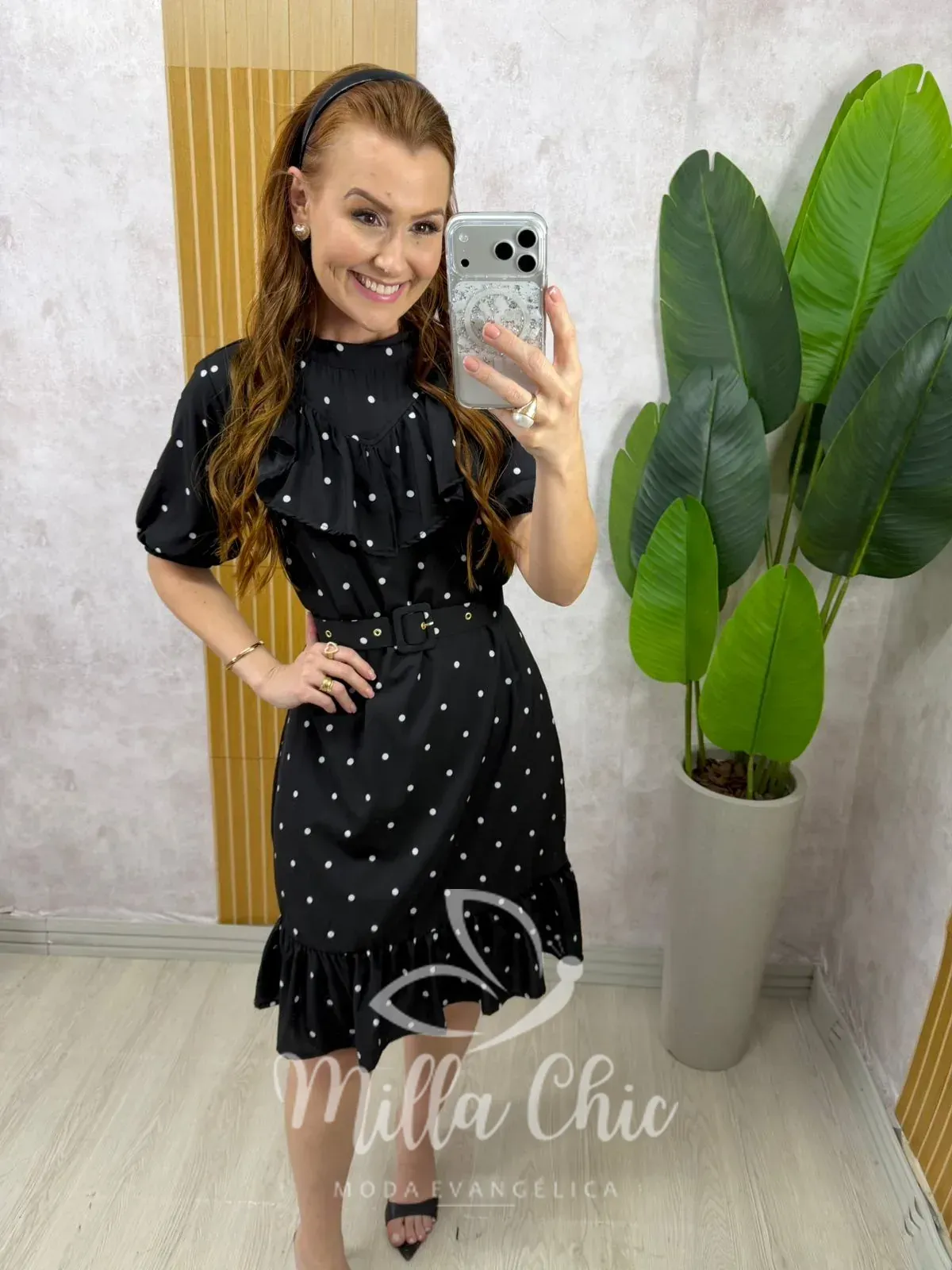 Possui gola intermediária levemente alta com regulagem no pescoço, proporcionando ajuste perfeito e elegante. O babado frontal traz delicadeza, enquanto a barra com leve babado garante movimento à peça.