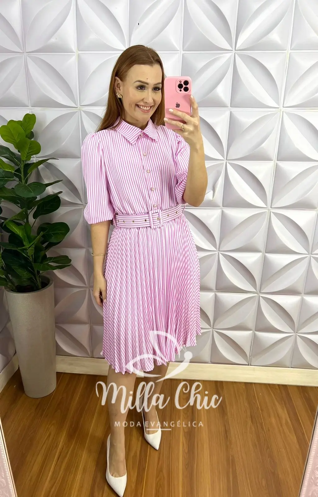 Vestido Alfaiataria Listrado Com Saia Plissada Manga 7/8 Aurora - Rosa - Milla Chic