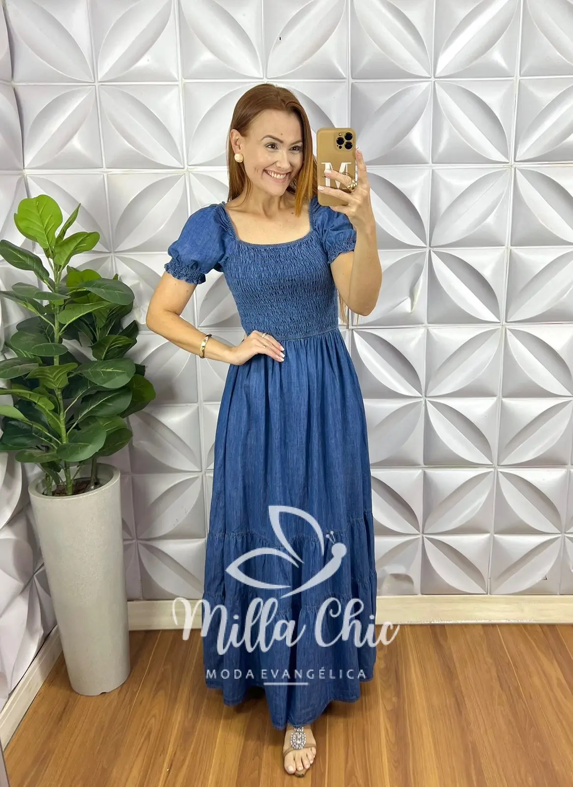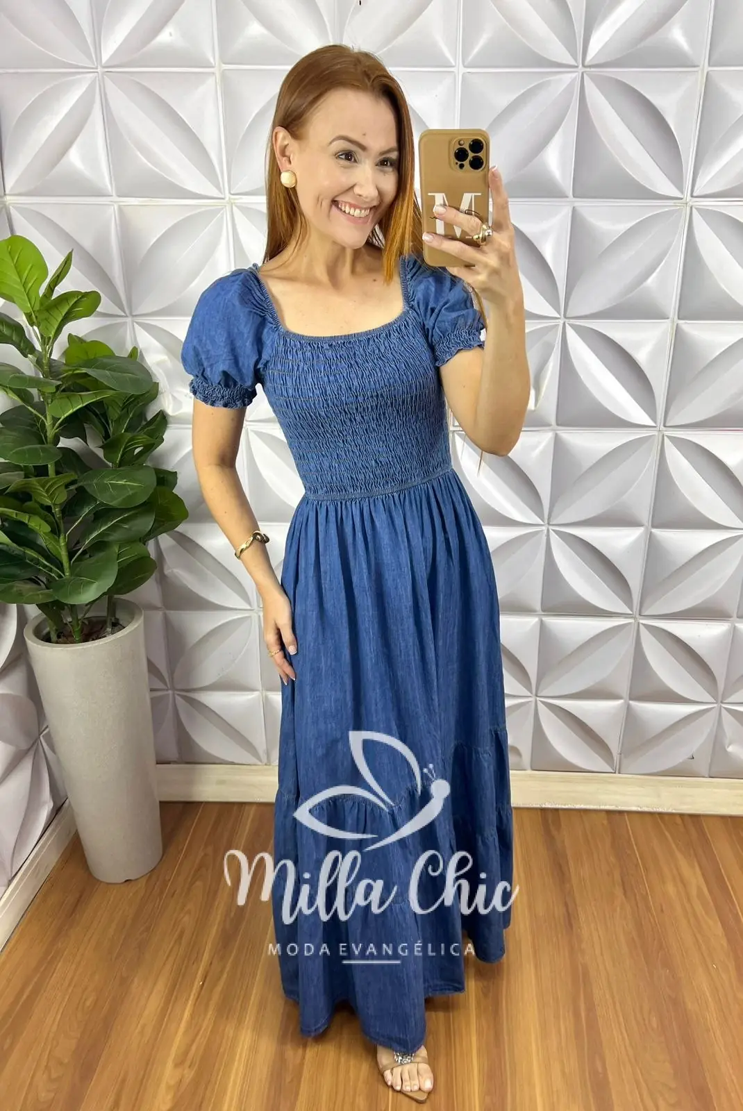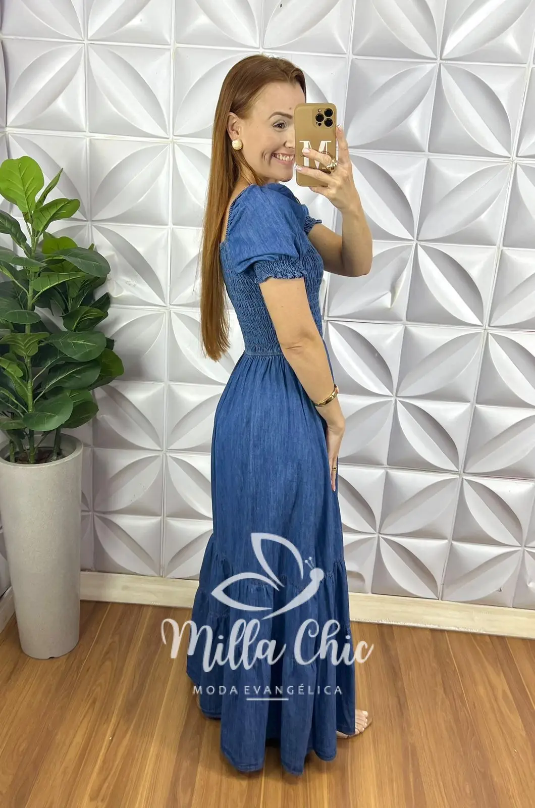 O nosso vestido Allmare é todo confeccionado no jeans .