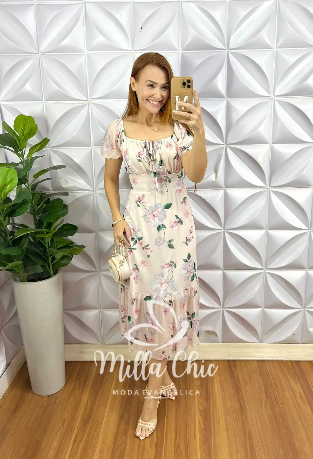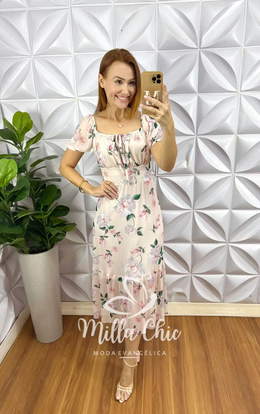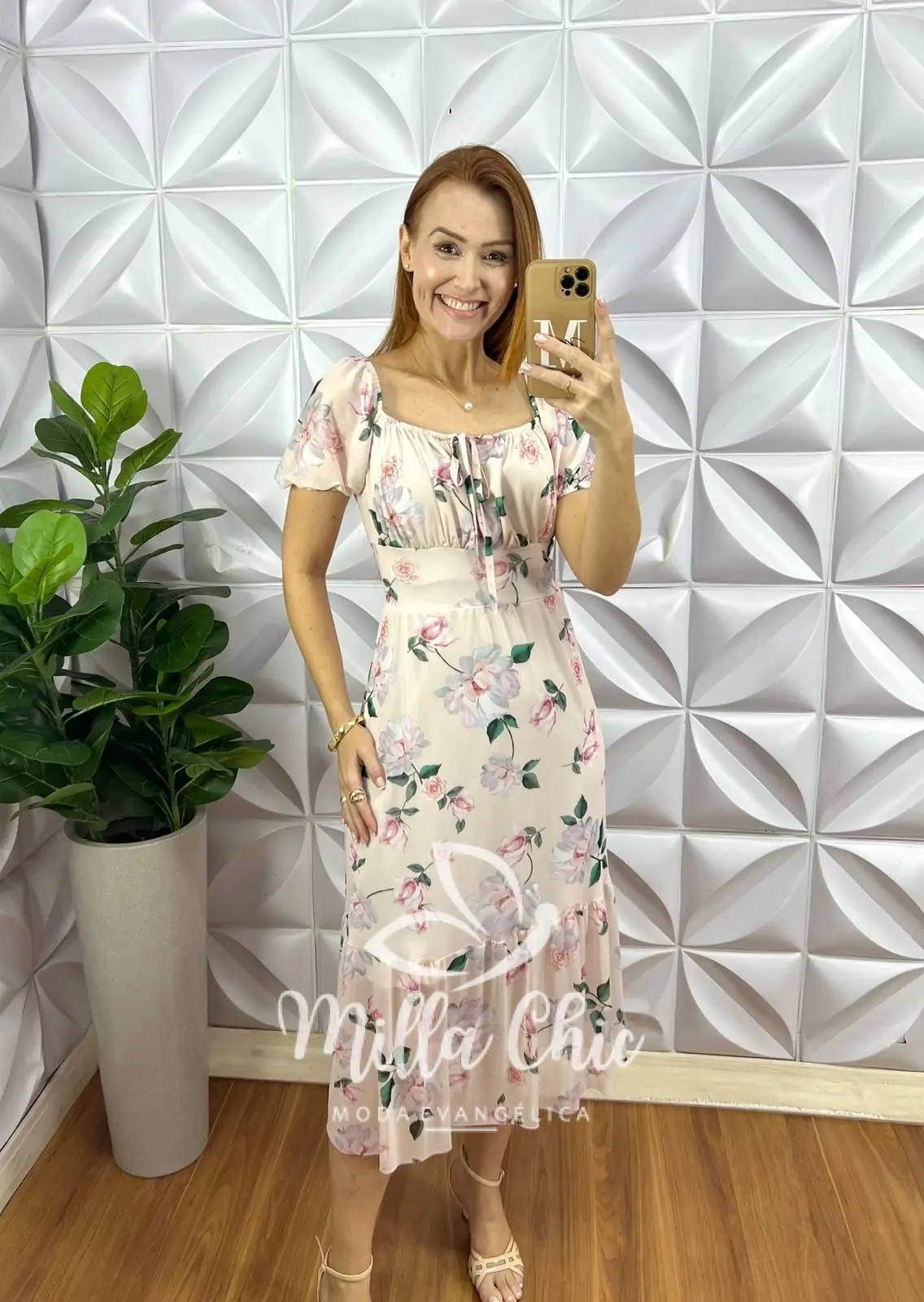 Todo confeccionado no tecido de tule. Que é aquele tecido todo furadinho. Em uma estampa leve e floral. Decote com drapeado no busto e regulagem que deixa tão feminino. A cintura é marcada por conta do elástico só na parte das costa, caimento mais justo no quadril e desce mais solto. Aquele vestido que veste muito bem. Quem prova se apaixona .