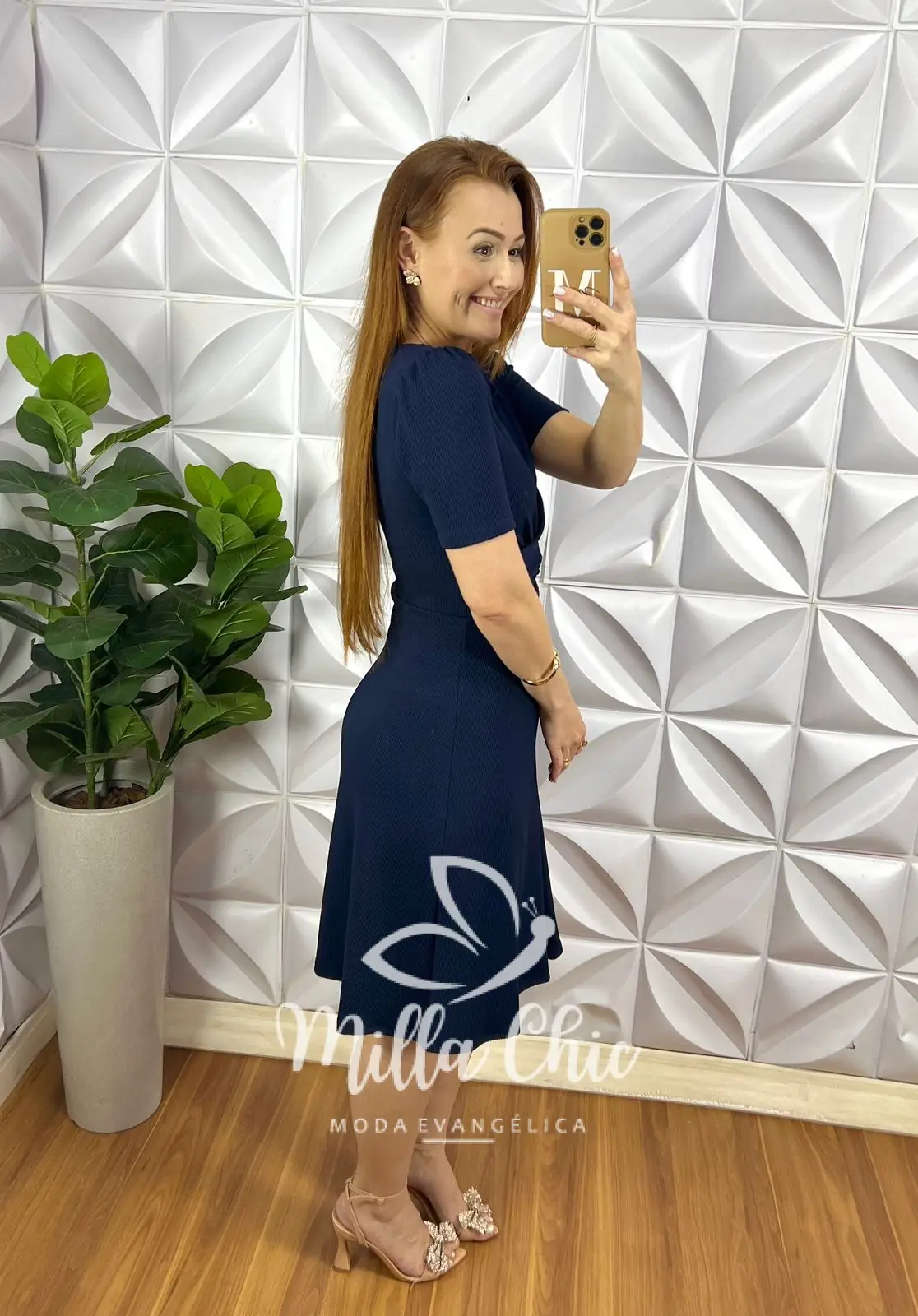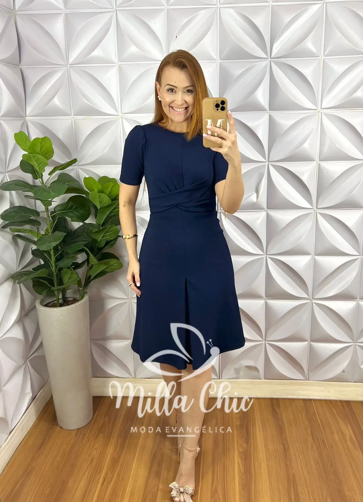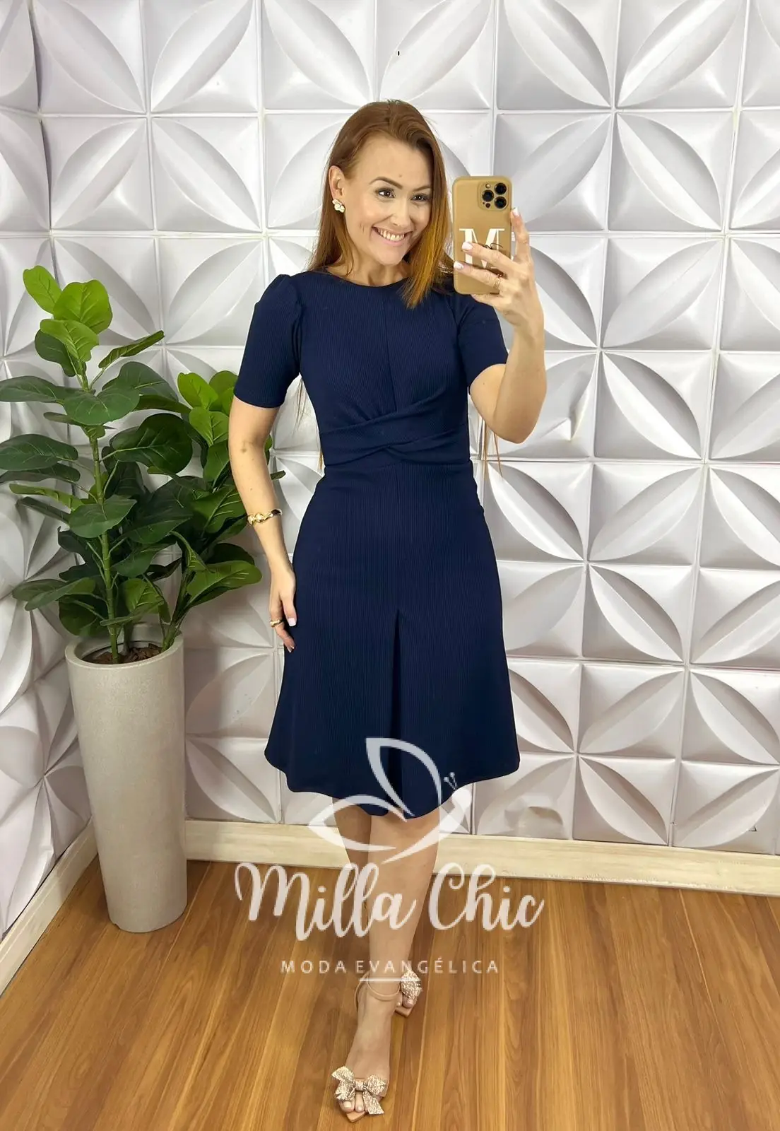 Possui: manga princesa, decote canoa, recorte no busto, cintura marcada com torção, comprimento ate o joelho, caimento evase com prega no centro da saia.