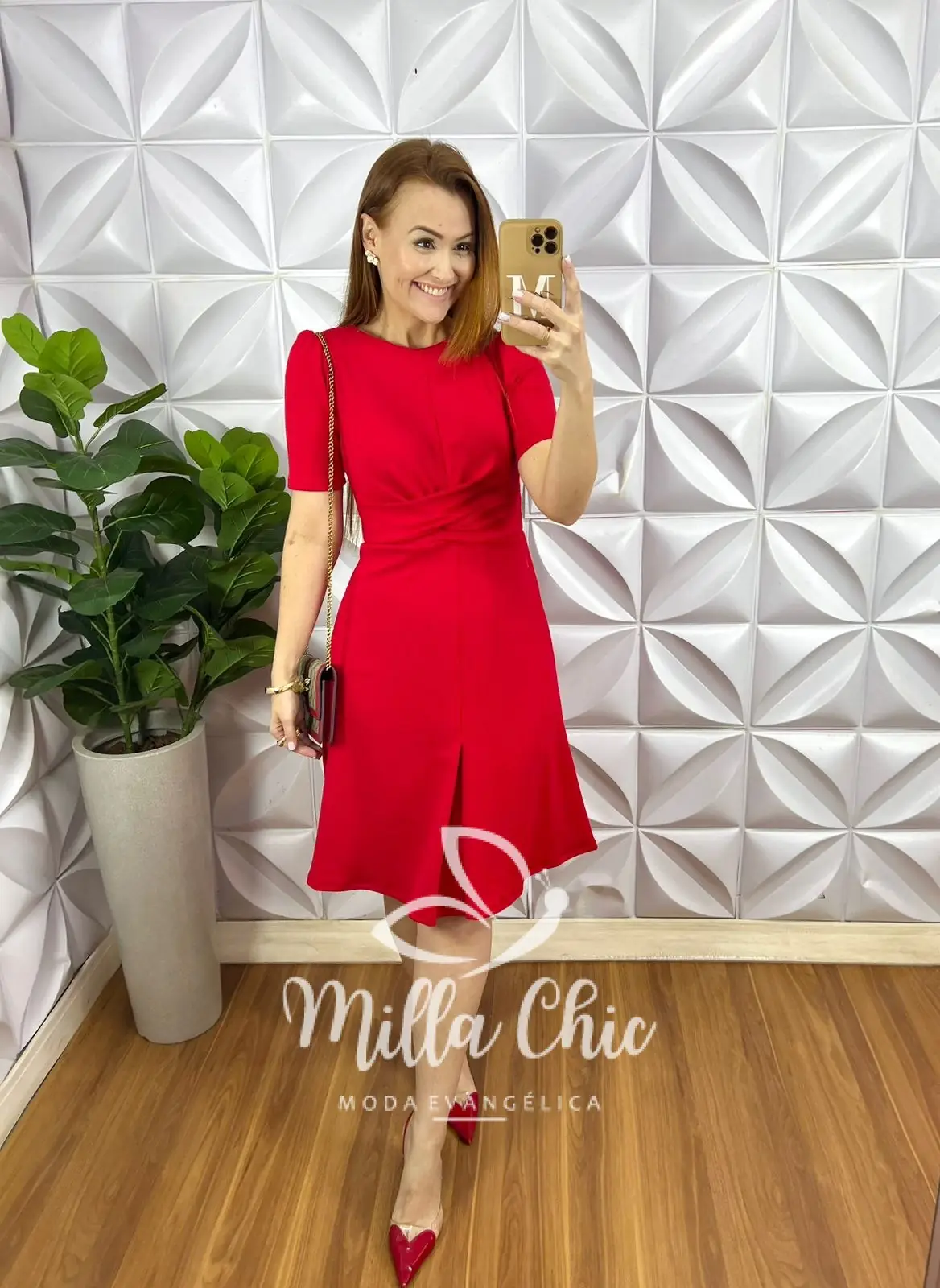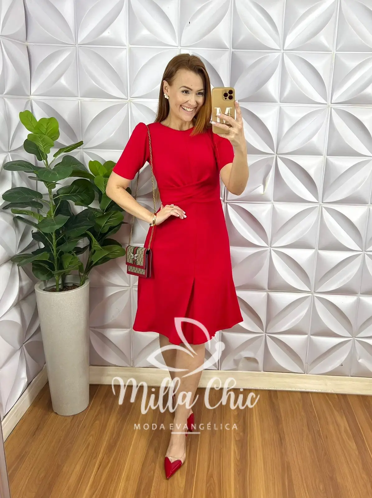 Possui: manga princesa, decote canoa, recorte no busto, cintura marcada com torção, comprimento ate o joelho, caimento evase com prega no centro da saia.