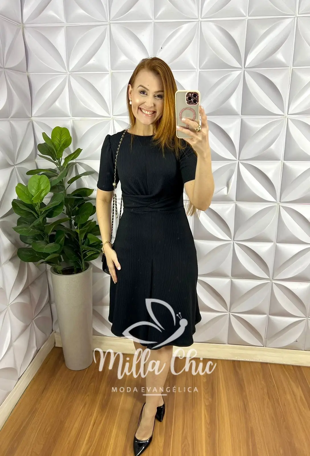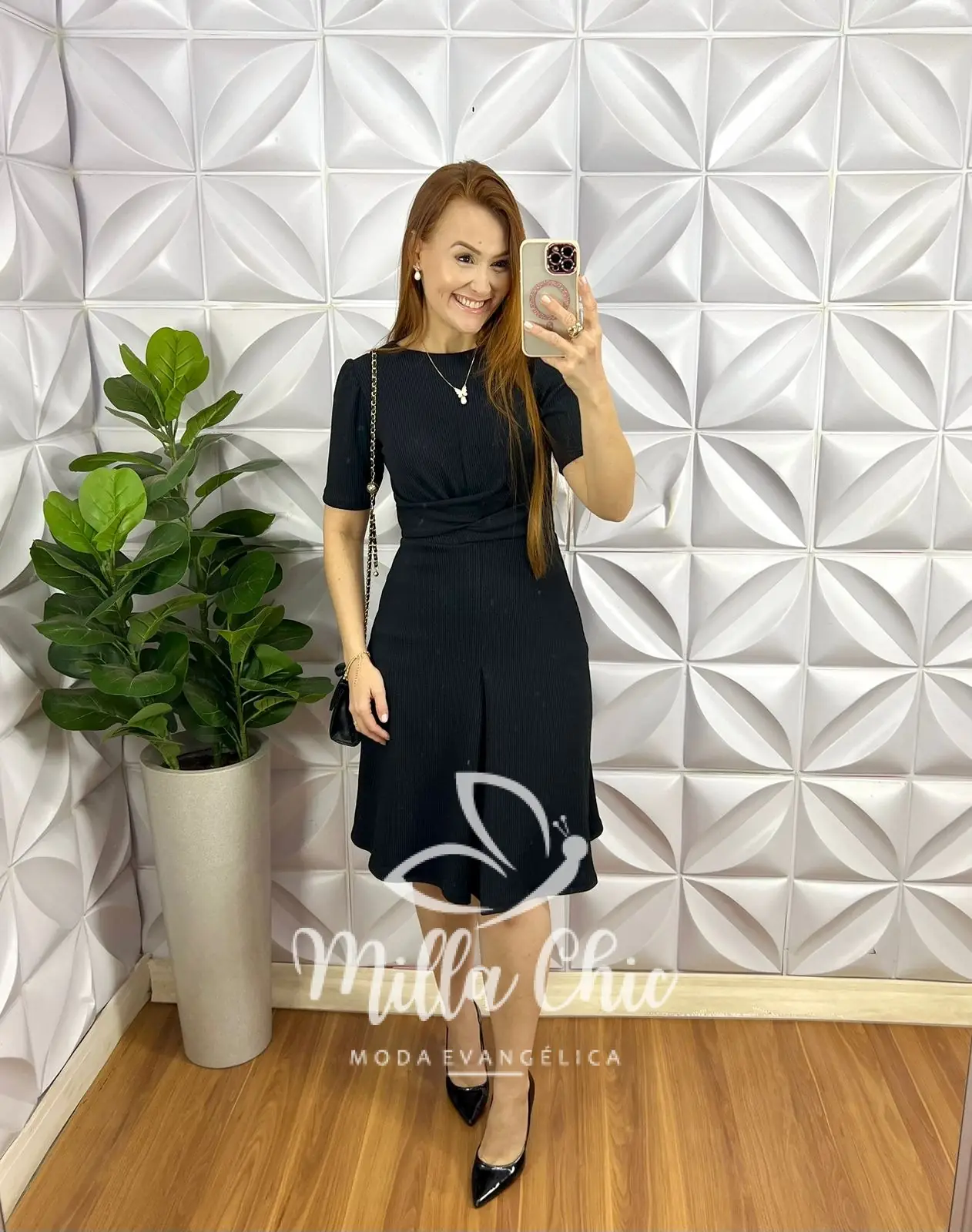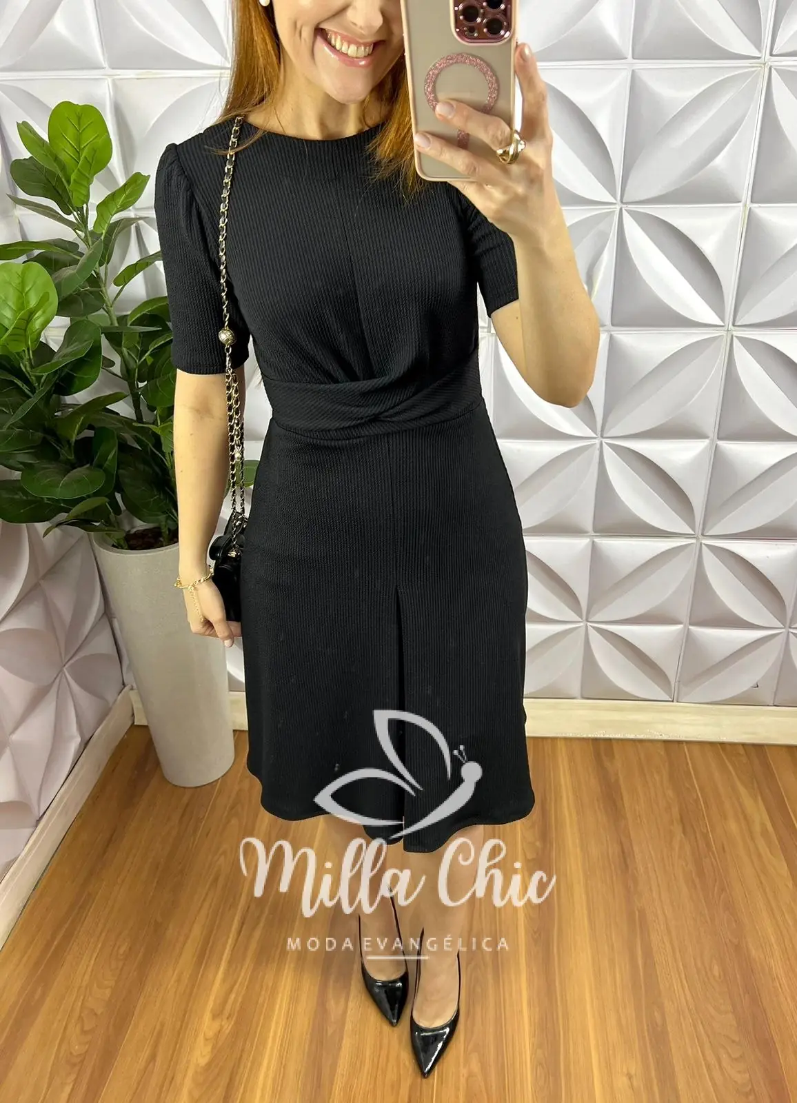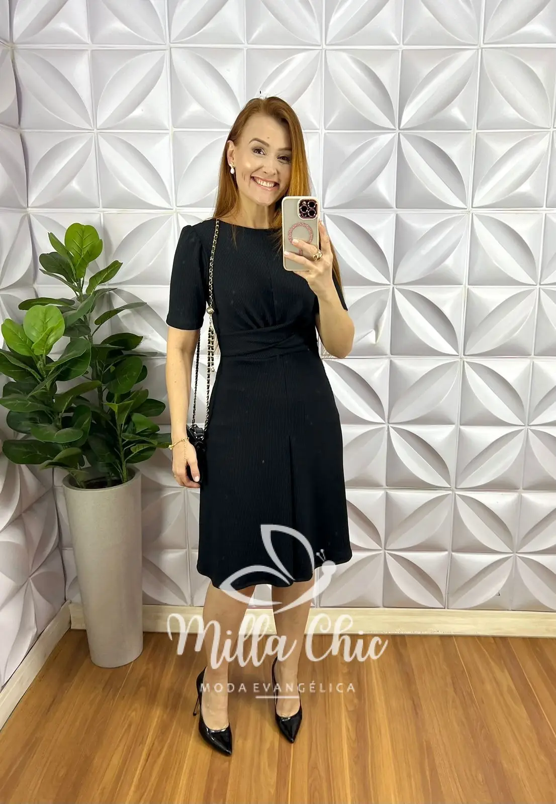 Possui: manga princesa, decote canoa, recorte no busto, cintura marcada com torção, comprimento ate o joelho, caimento evase com prega no centro da saia.