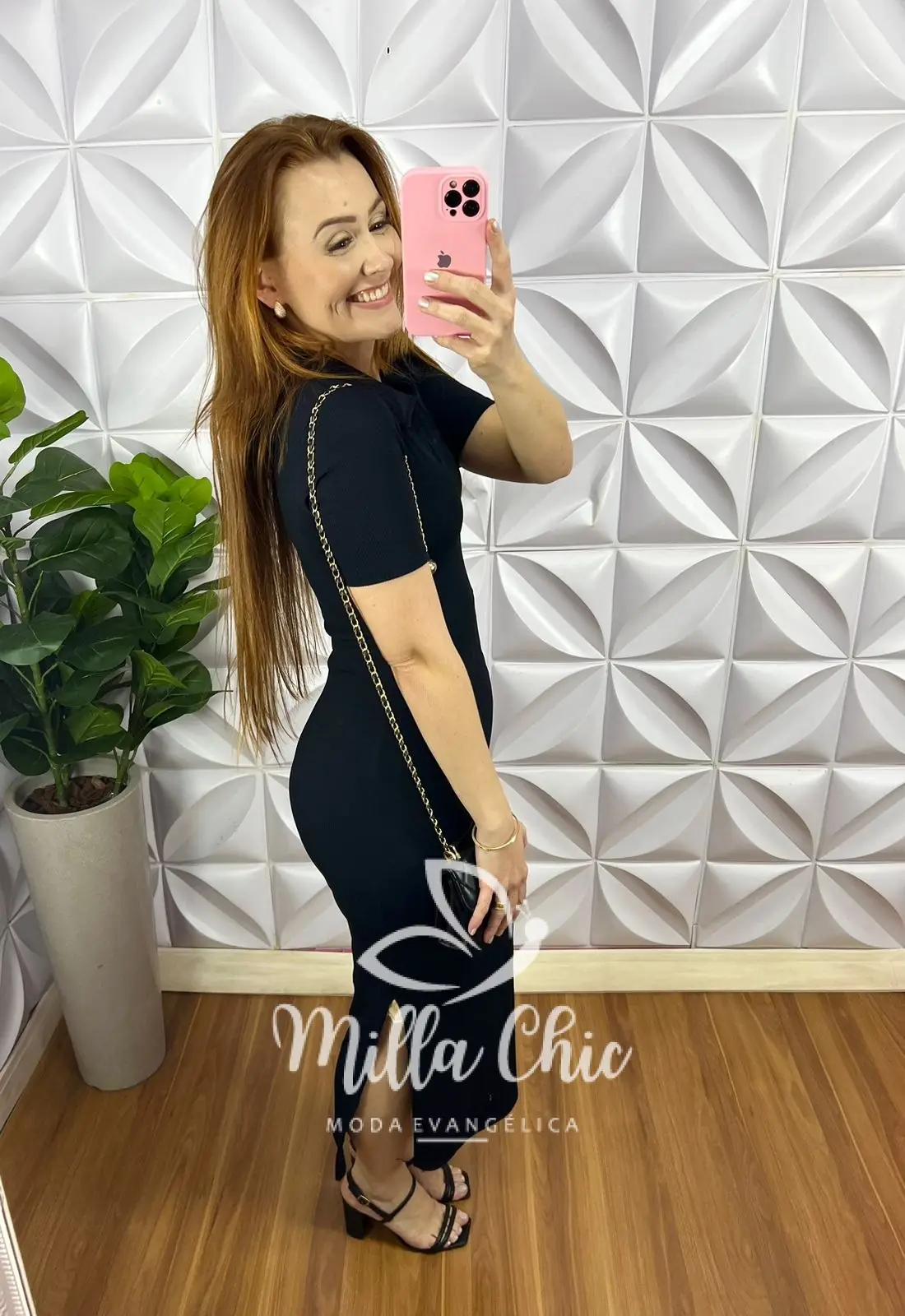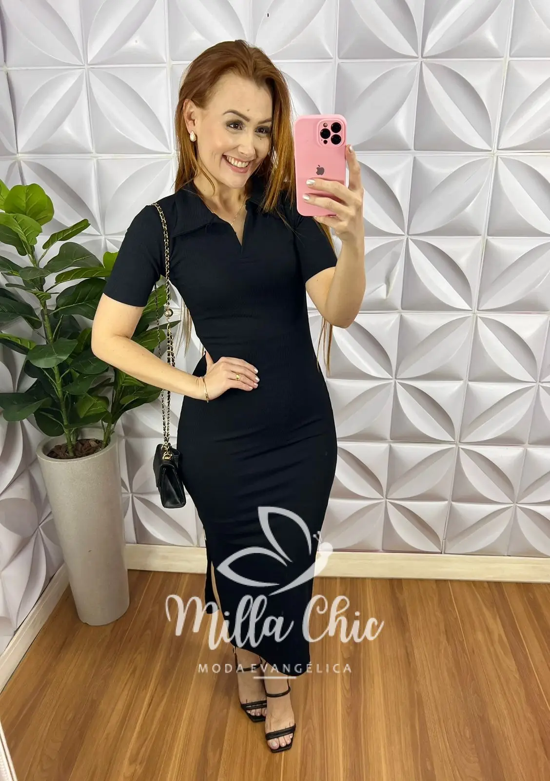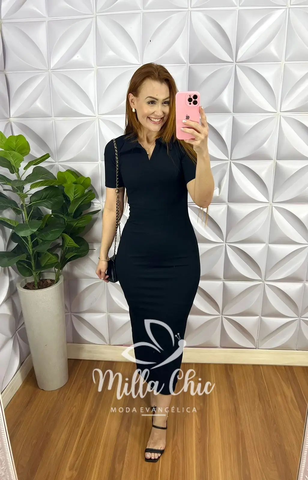 Vestido Anarruga Tubinho Gola Polo Mídi Dani - Preto - Milla Chic