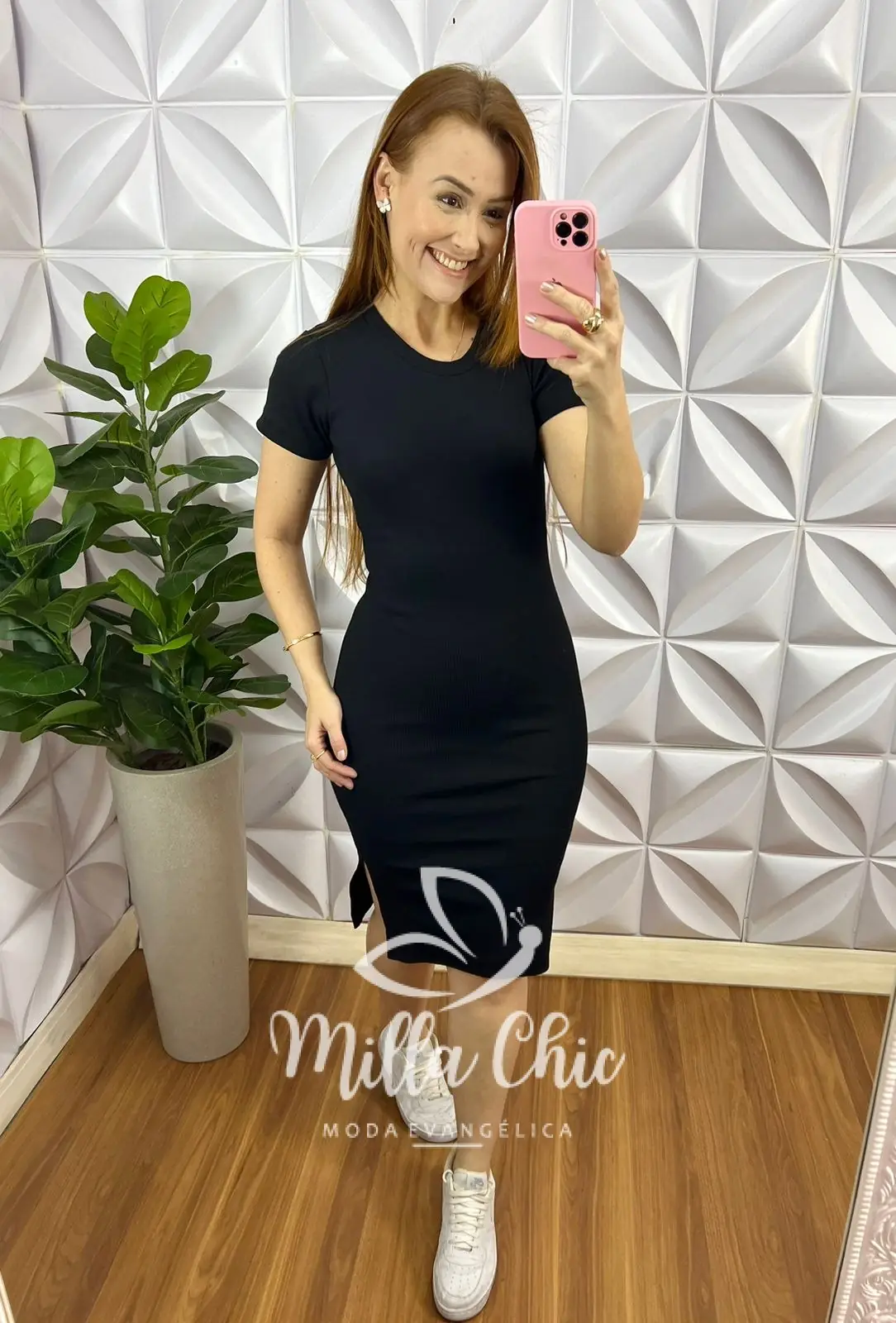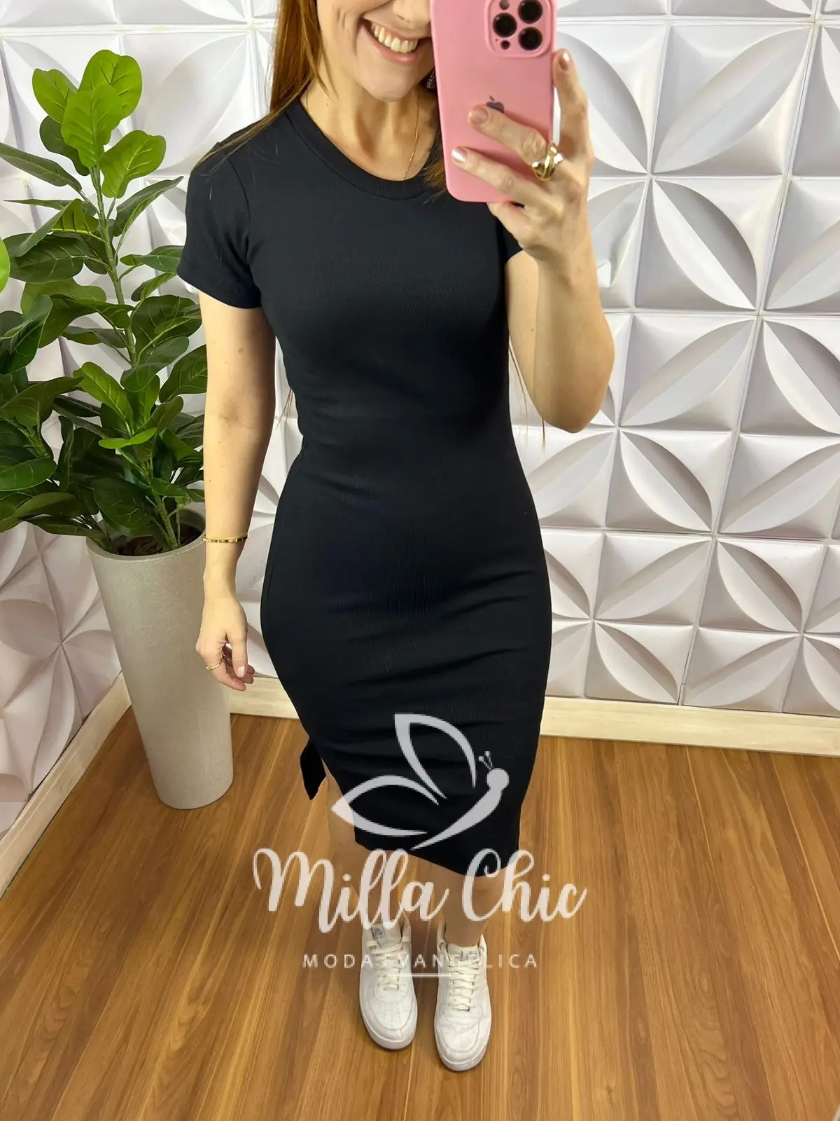 Vestido Canelado Ribanna Curto Candy Color fenda lateral Maria - Preto - Milla Chic