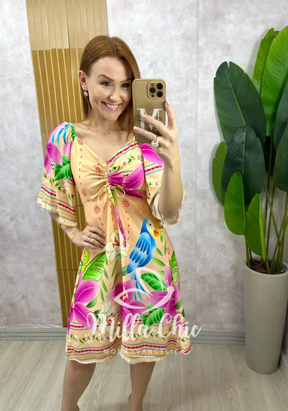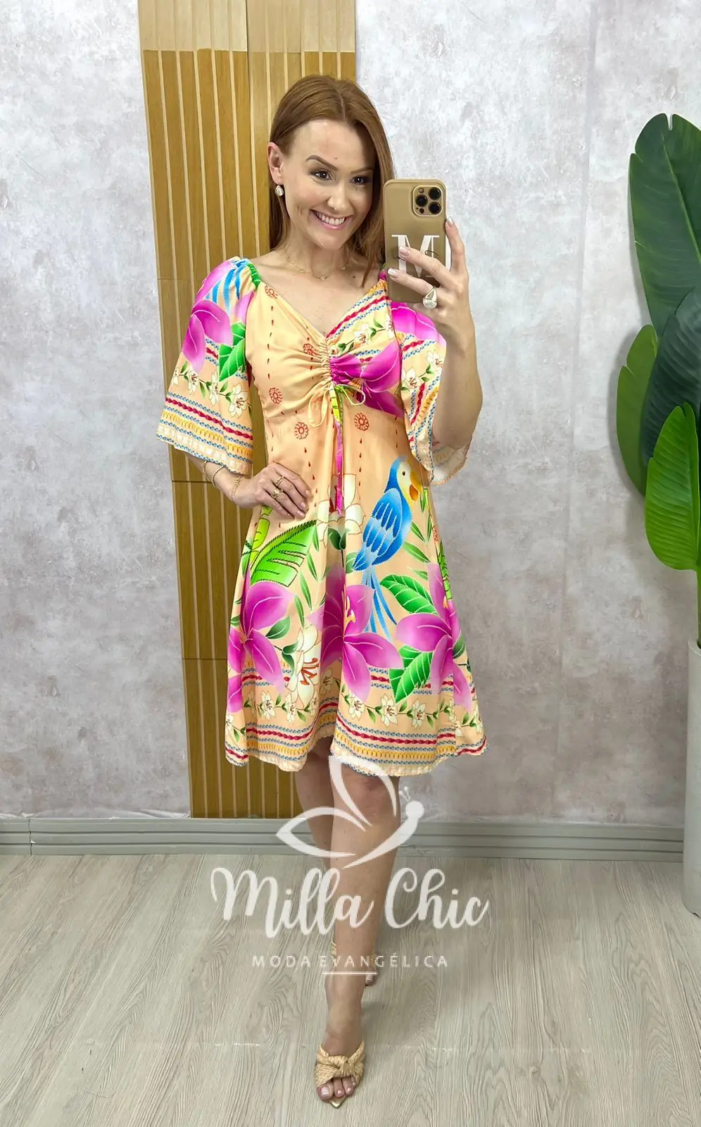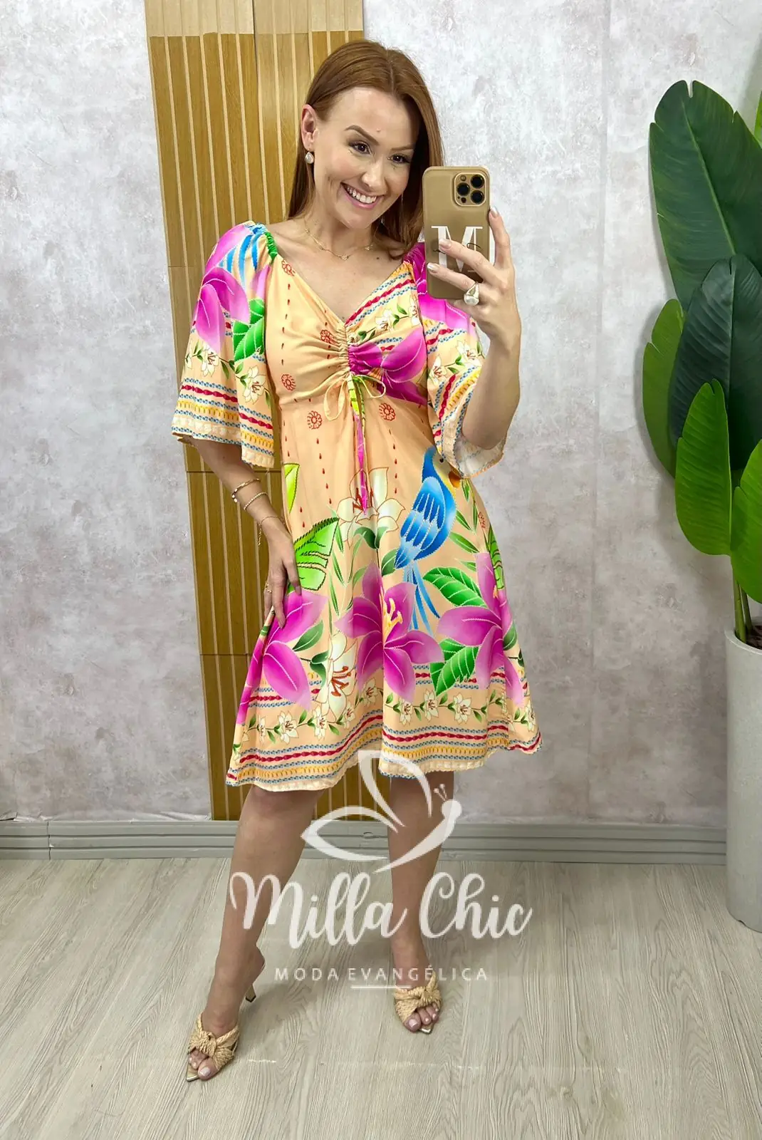 O vestido Catarina tem essa estampa linda tropical e bem verão que transmite elegância e autenticidade. Ele apresenta o comprimento até joelho possui elastex nas costas que que traz conforto e com uma modelagem acinturada proporcionando um caimento perfeito. Ele une praticidade e charme, permitindo que você carregue estilo encantador.