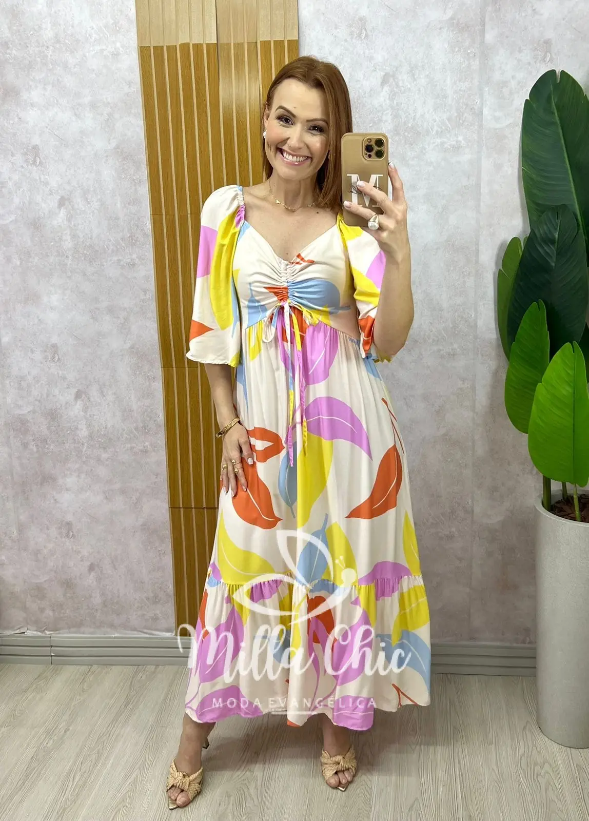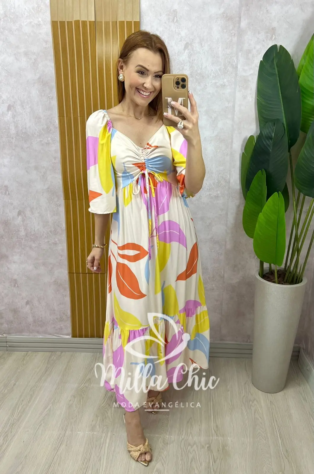 O vestido Catarina tem essa estampa linda tropical e bem verão que transmite elegância e autenticidade. Ele apresenta um design midi possui elastex nas costas que valoriza a silhueta feminina, proporcionando um caimento perfeito. Ele une praticidade e charme, permitindo que você carregue estilo encantador.