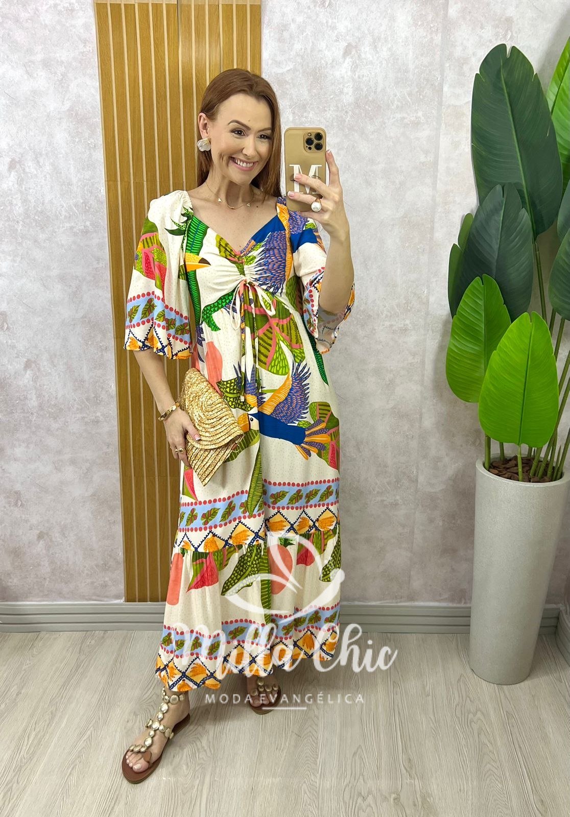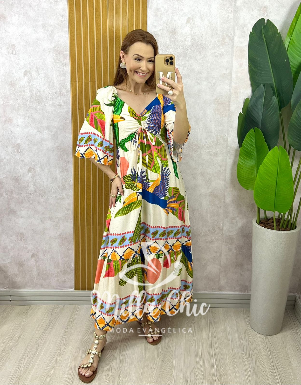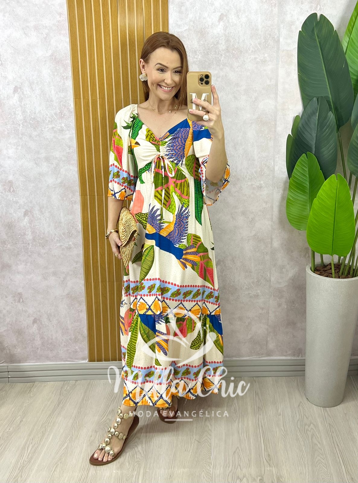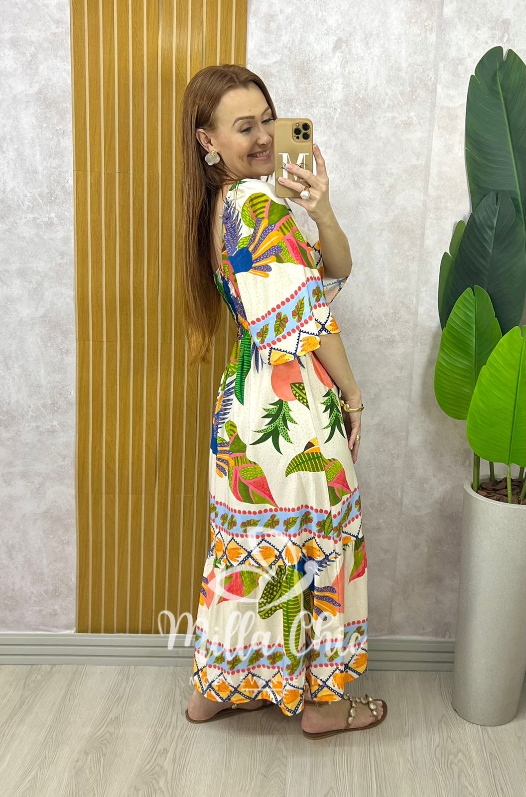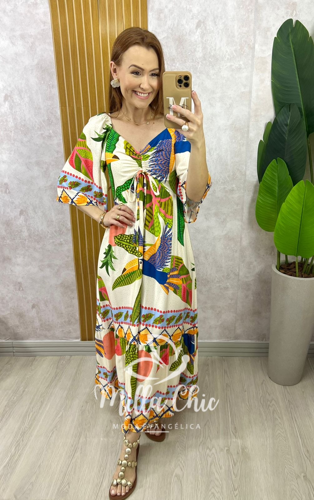 O vestido Catarina tem essa estampa linda tropical e bem verão que transmite elegância e autenticidade. Ele apresenta um design midi possui elastex nas costas que valoriza a silhueta feminina, proporcionando um caimento perfeito. Ele une praticidade e charme, permitindo que você carregue estilo encantador.