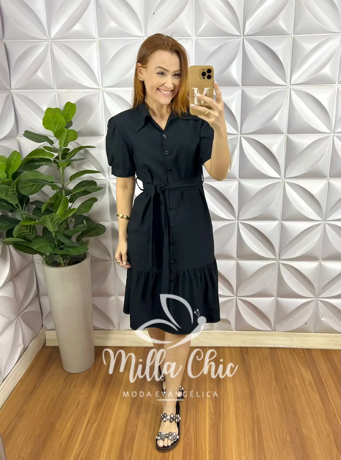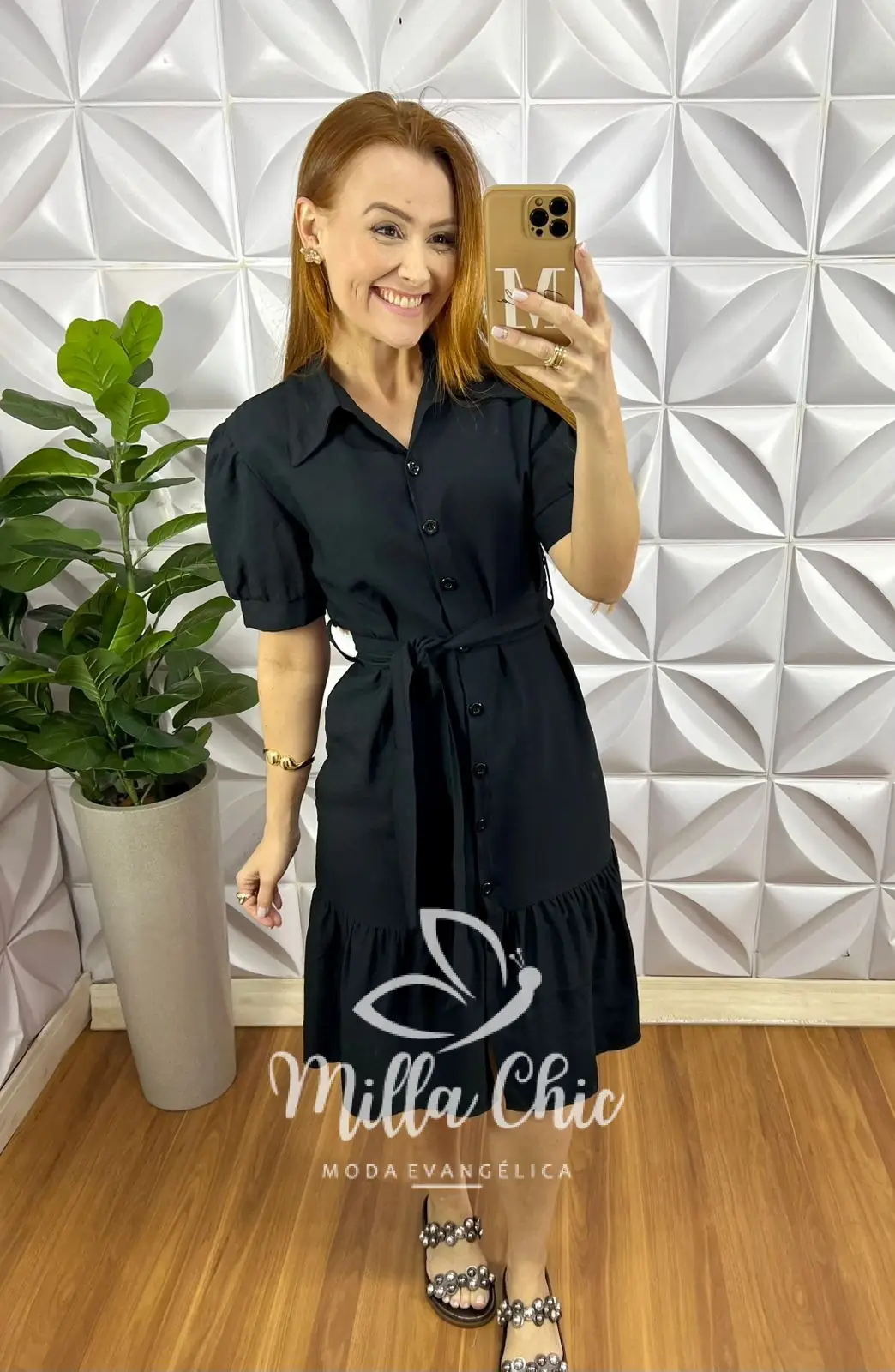 Vestido Chemise Alfaiataria Amarrant Manga Princesa Faixa Cinto Carla – Preto