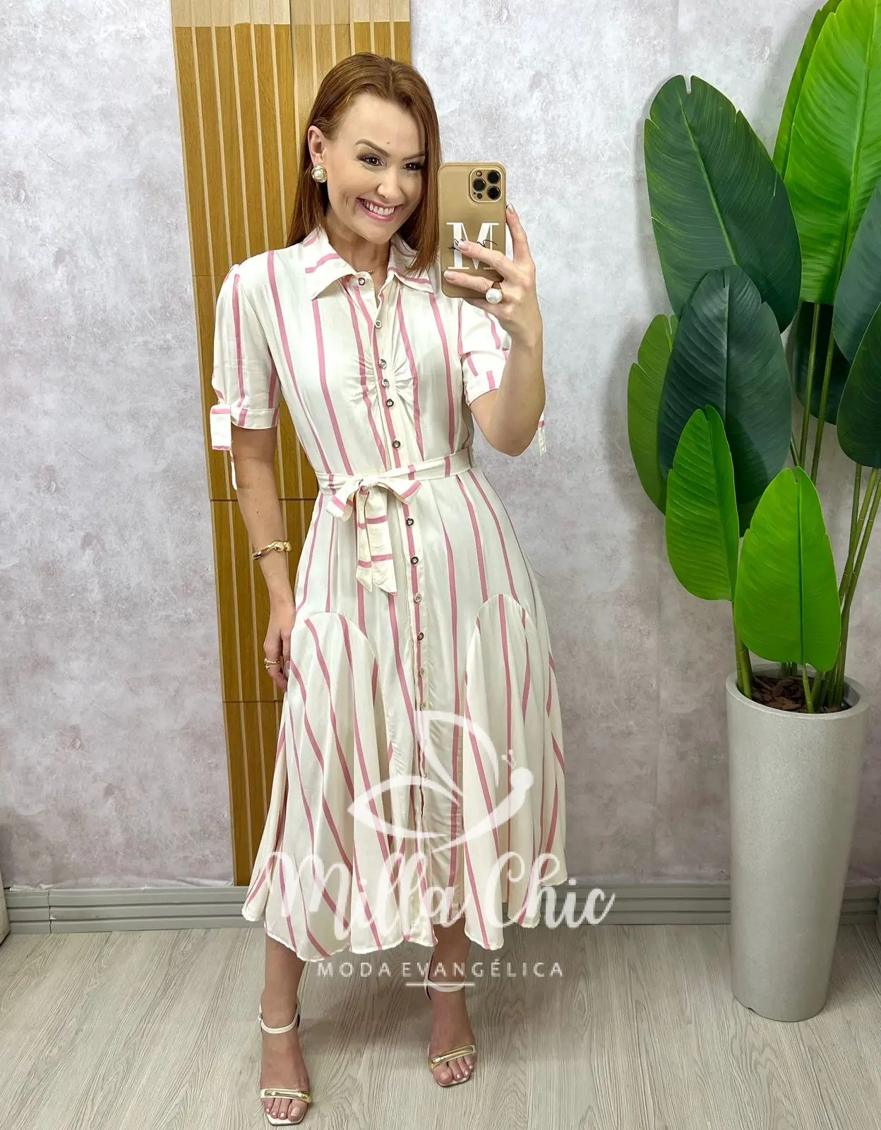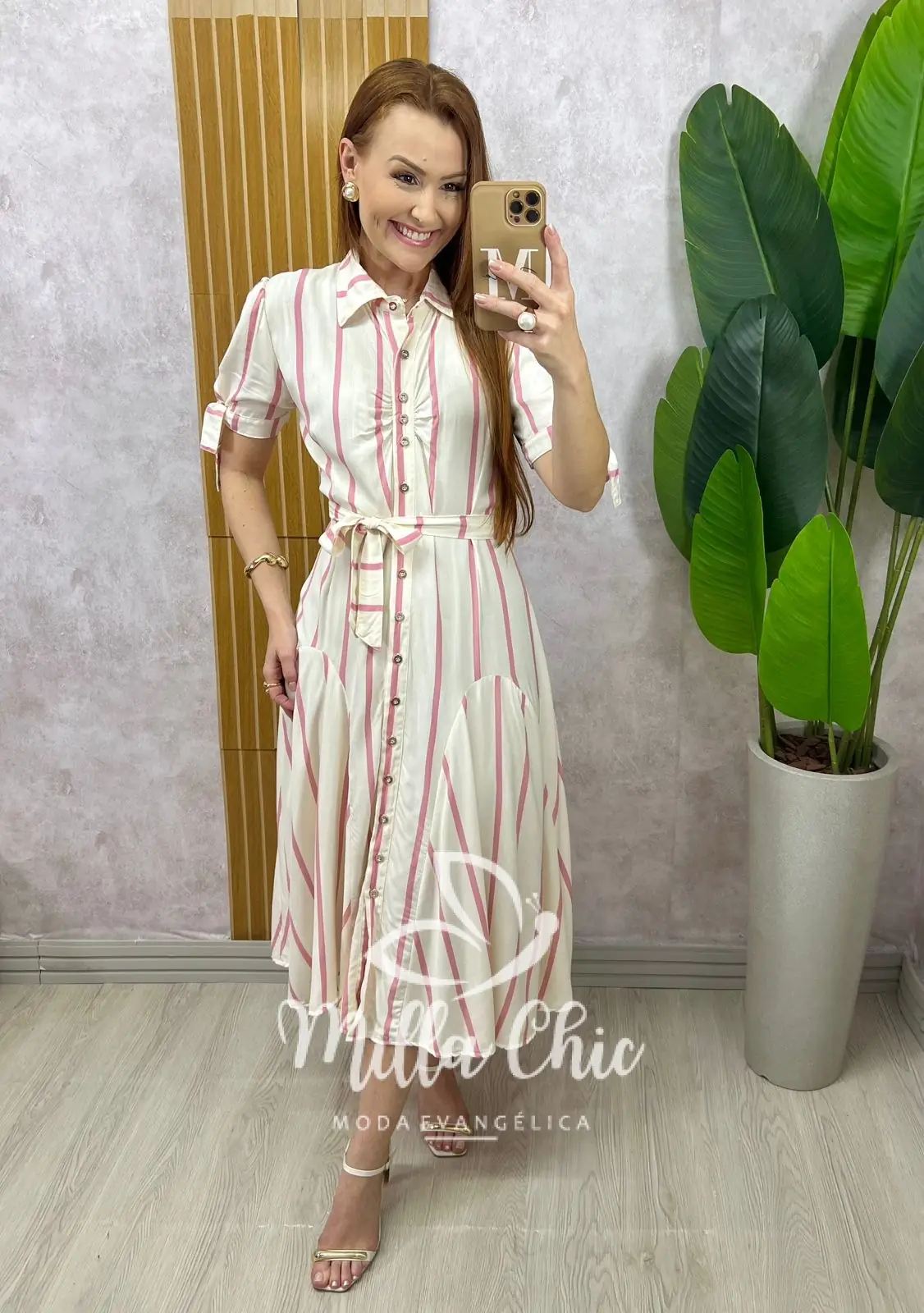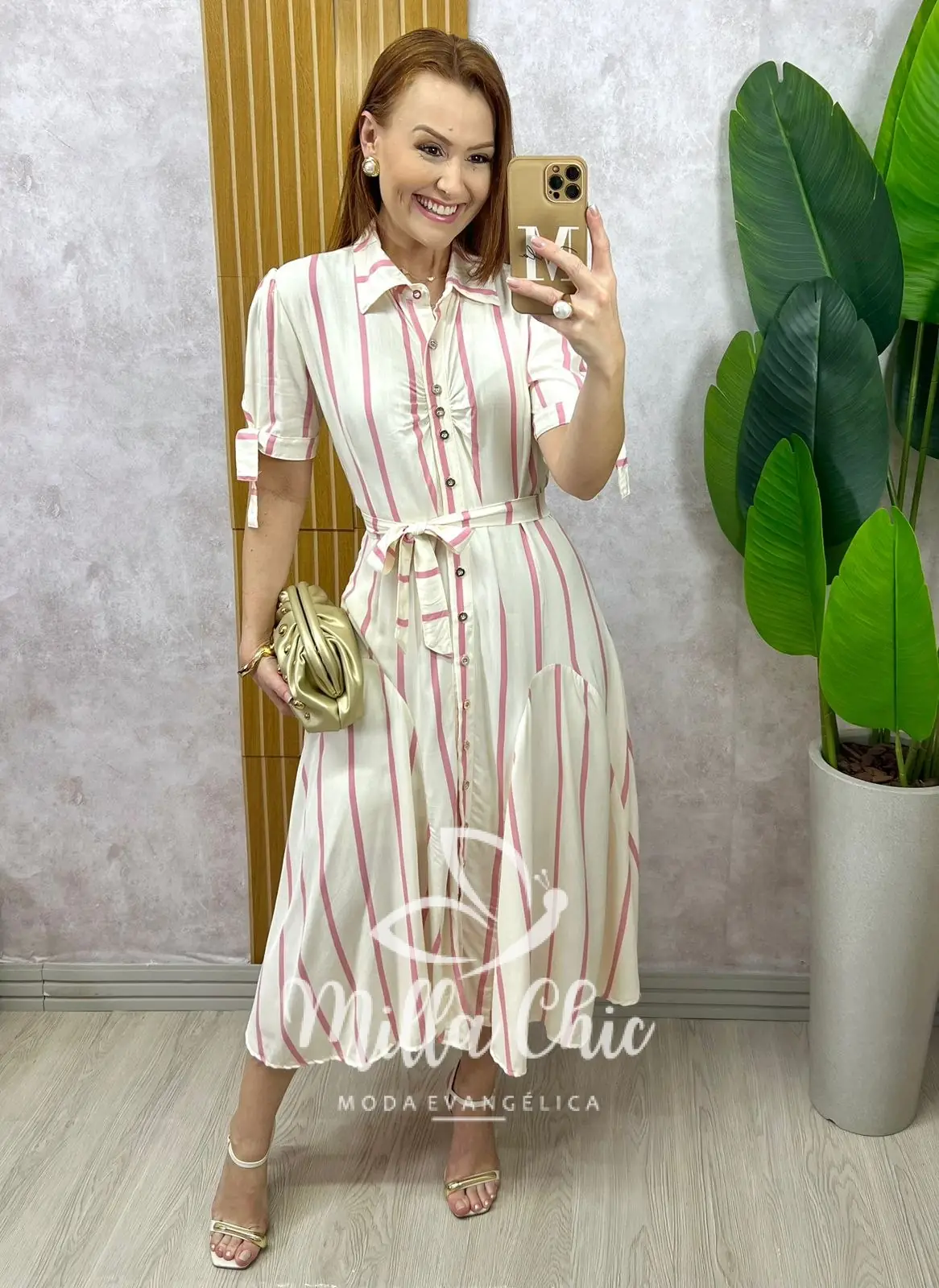 Em uma proposta de chemise com todos os botões funcionais . Os botões são metalizados em dourado que deixa ele ainda mais lindo e elegante.