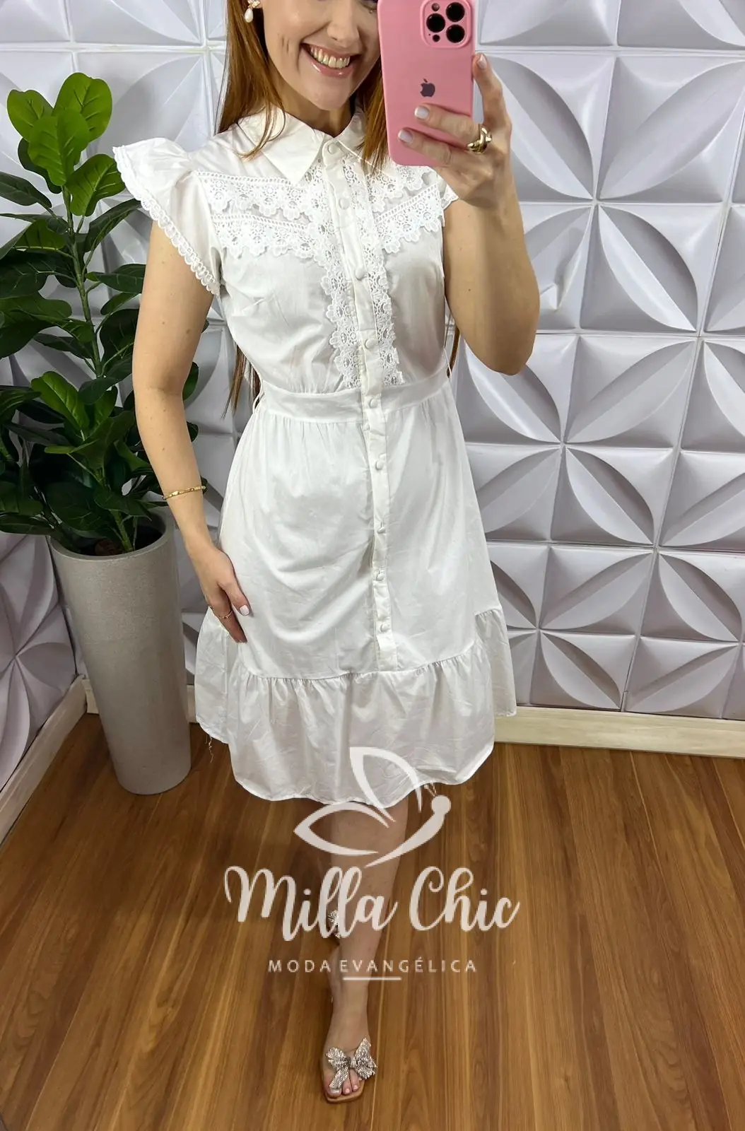 Vestido Chemise No Tricoline Com Bordados De Guipper Muriele – Branco