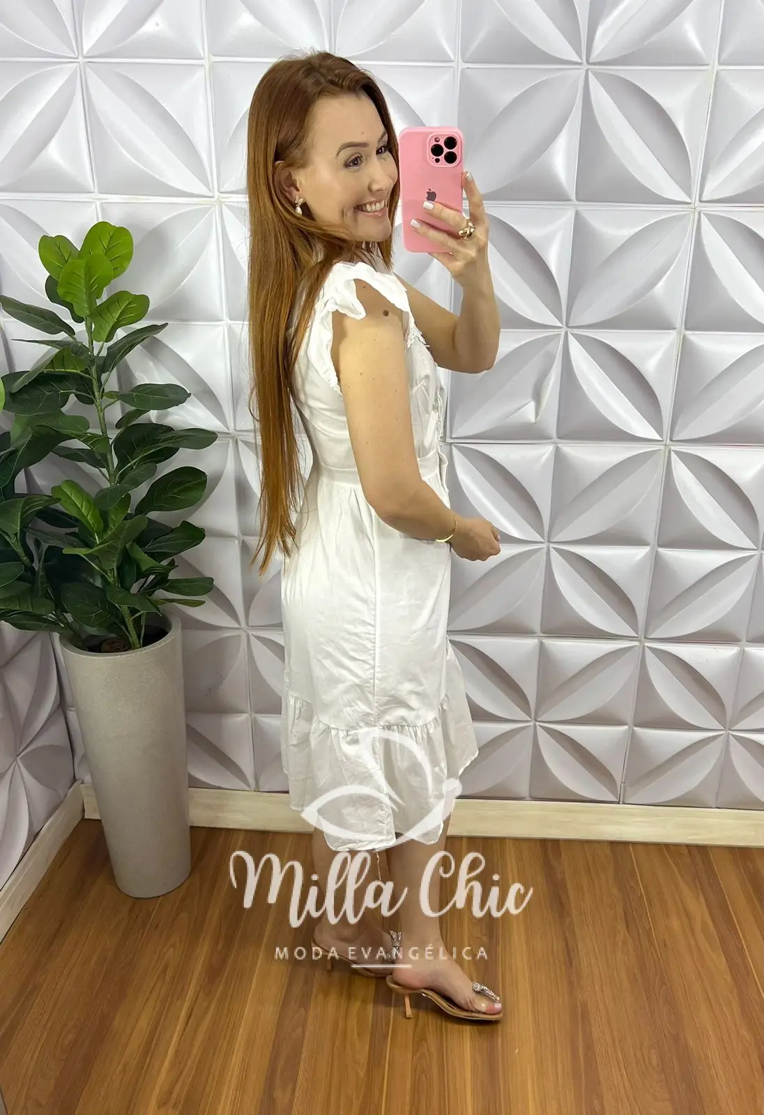 Possui: Gola polo, manga babadinho com barrado de guipper, detalhe de guipper no busto, botões encapados funcionas, cintura marcada, comprimento abaixo do joelho, caimento evase com babado na barra, forrado.