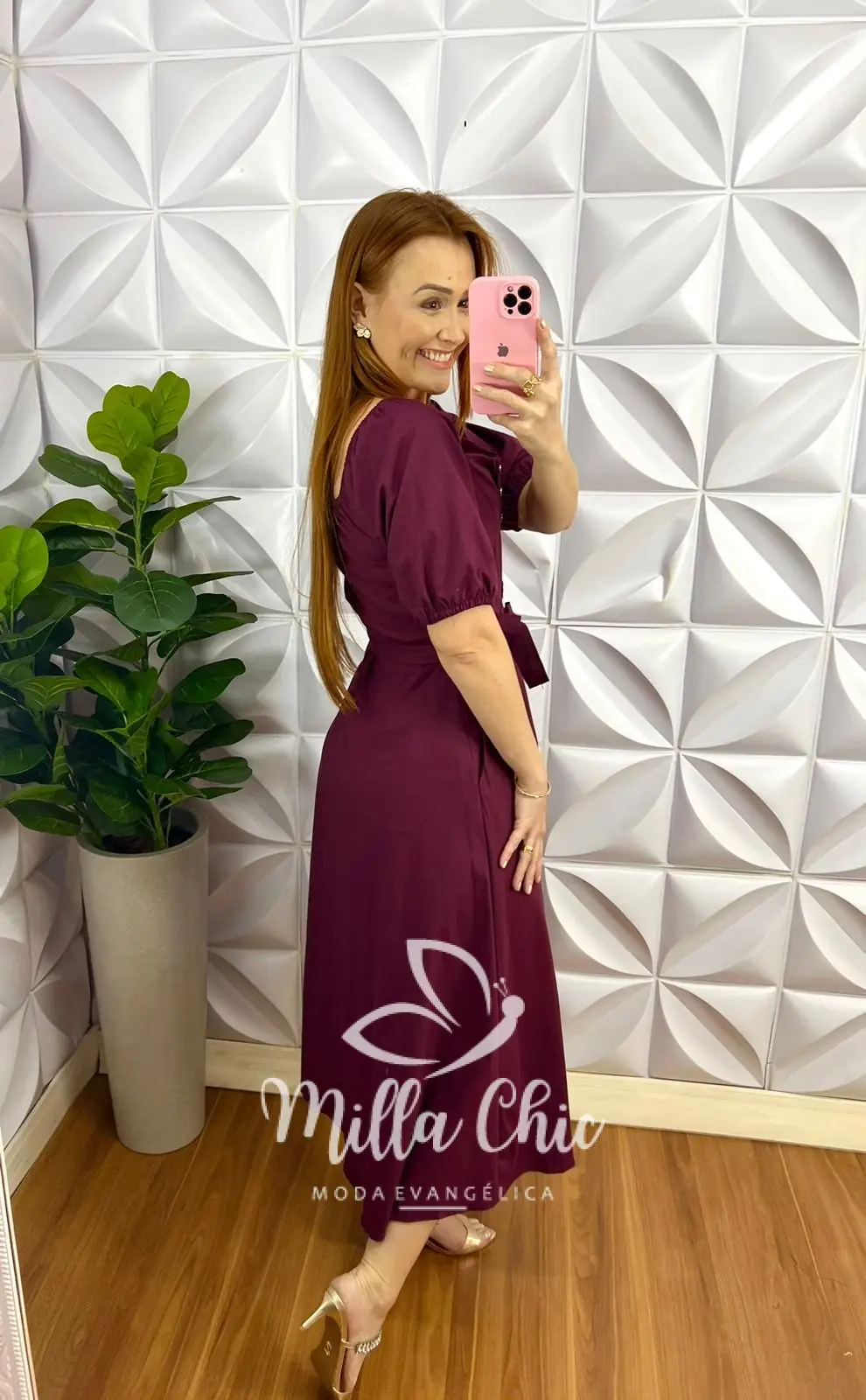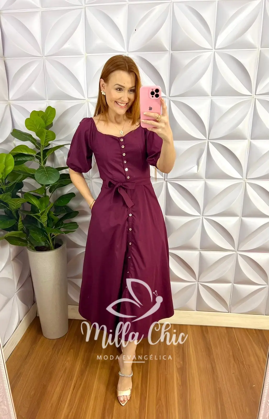 Vestido Chemise Tricoline Manga Princesa Max Mídi Camila - Cherry - Milla Chic