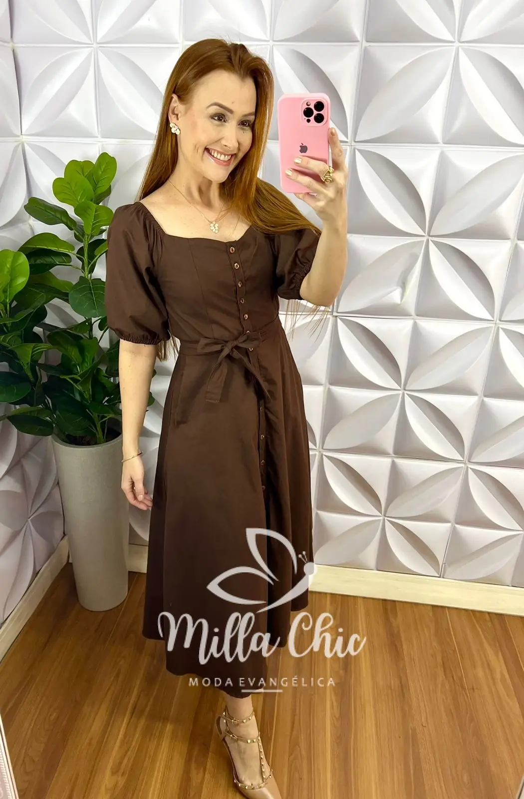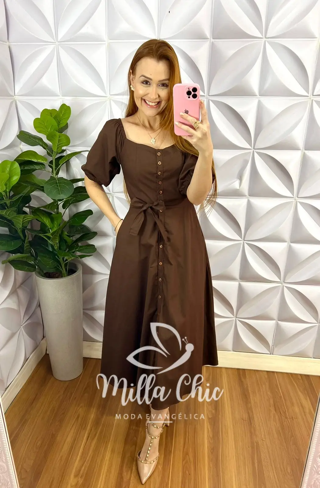 Vestido Chemise Tricoline Manga Princesa Max Mídi Camila - Marrom - Milla Chic