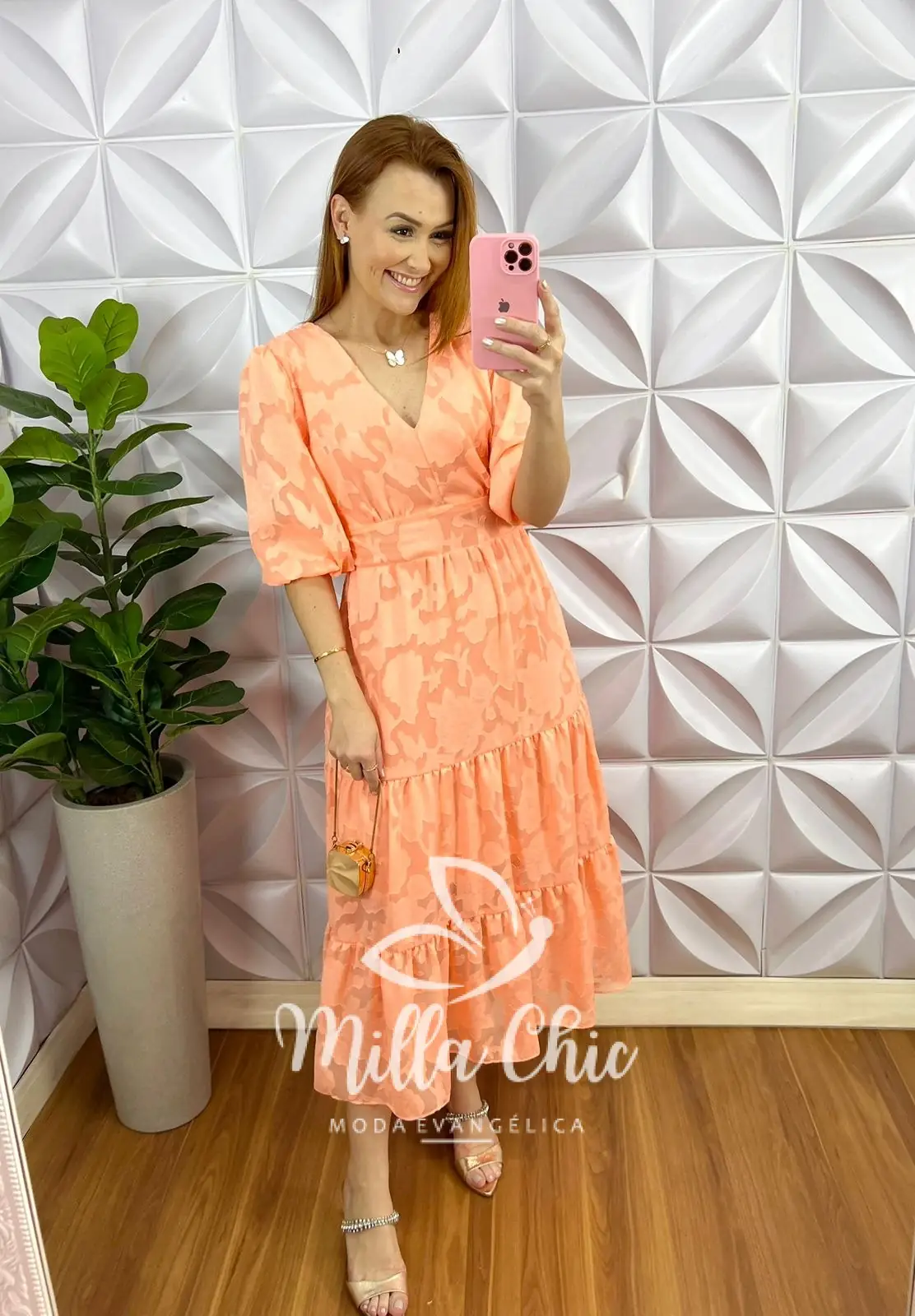Vestido Chiffon Com Devorê Manga 3/4 Mídi Três Marias Moana - Pêssego - Milla Chic