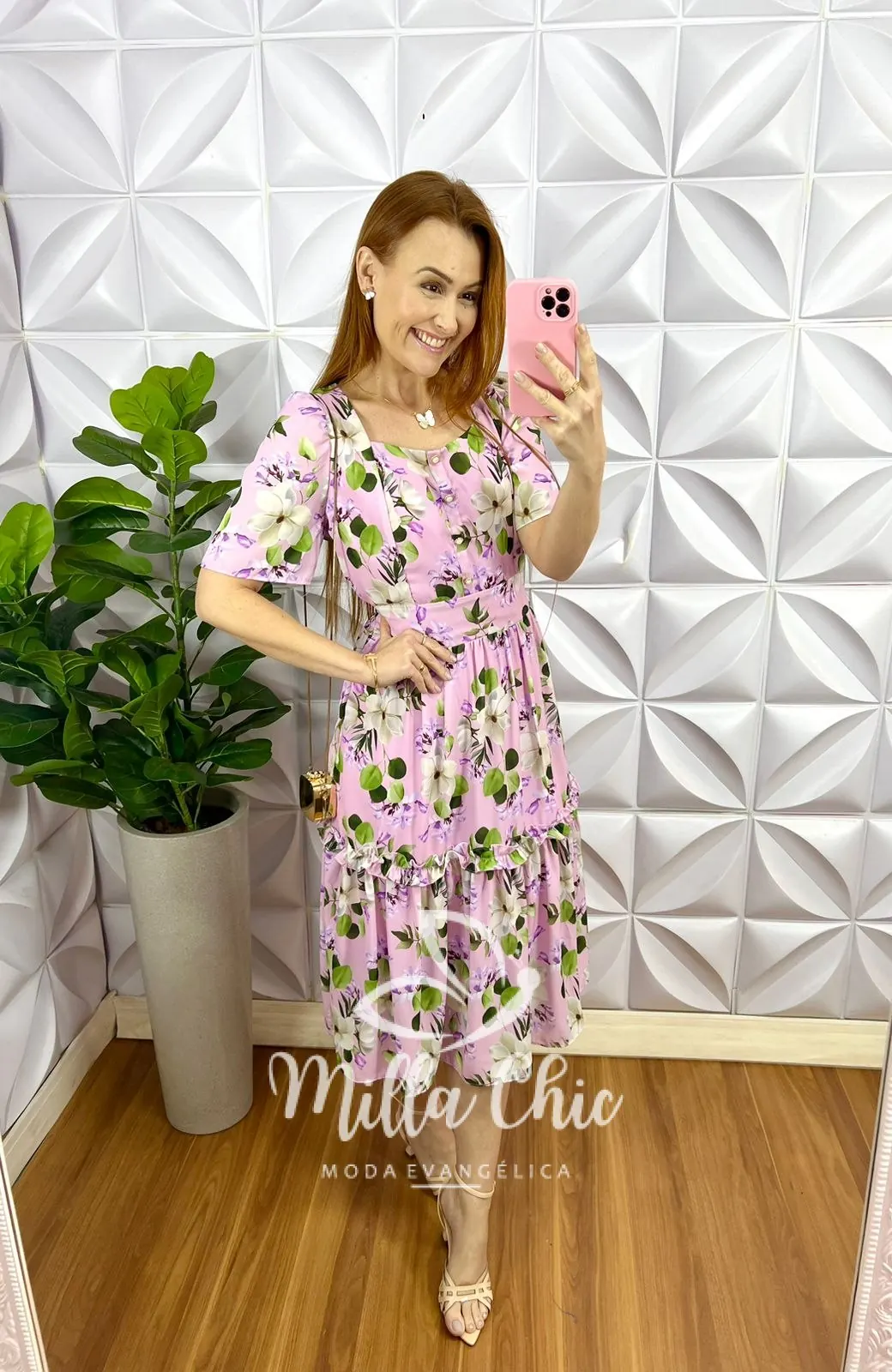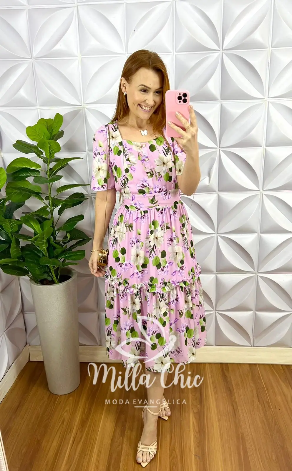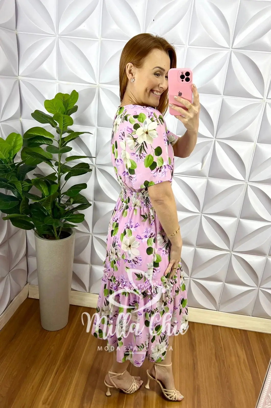 Vestido Chiffon Floral Botões Perolado Mídi Catherine - Rosa - Milla Chic