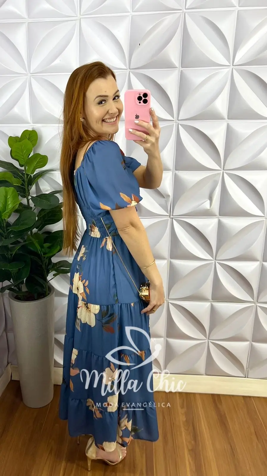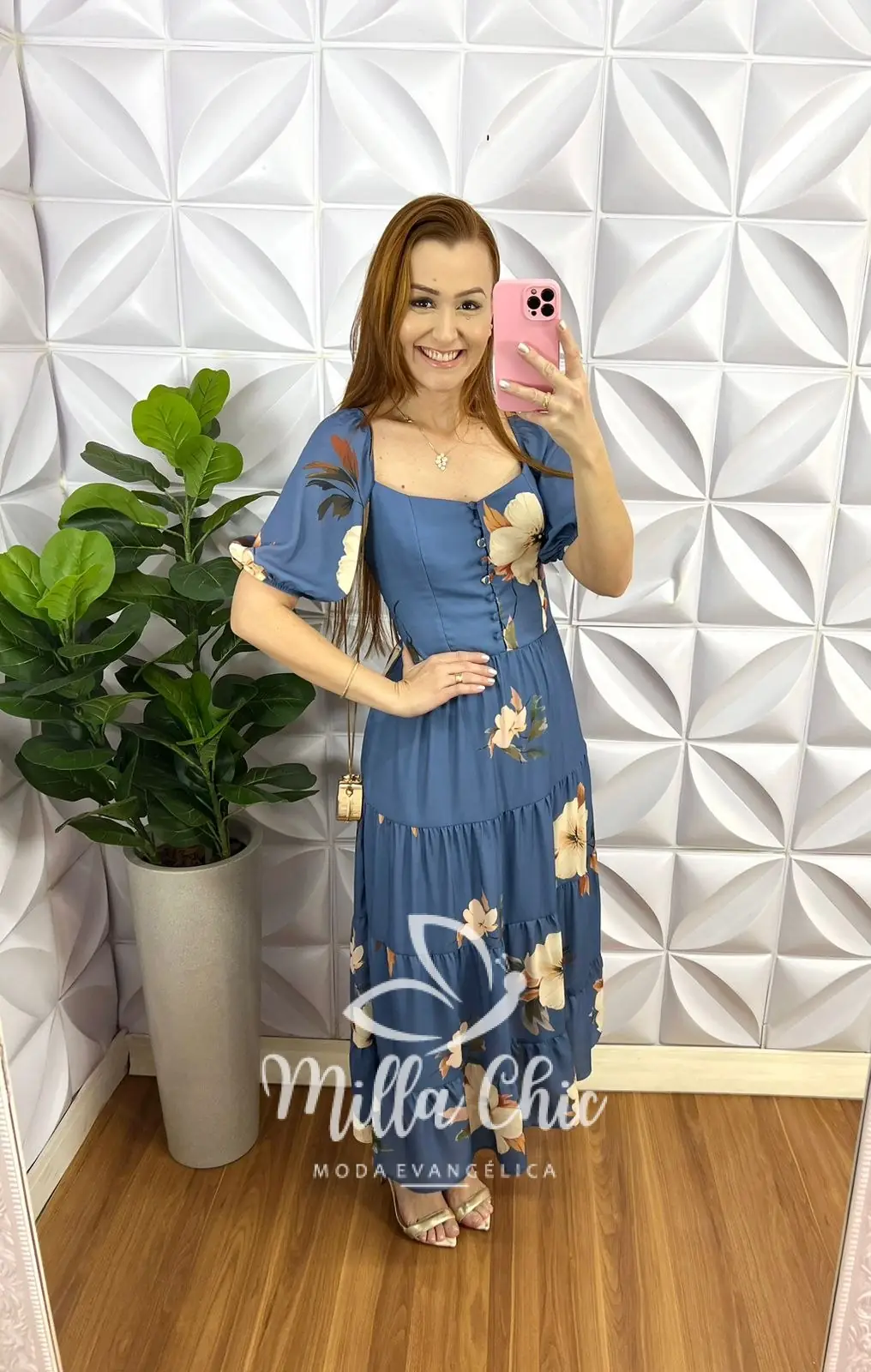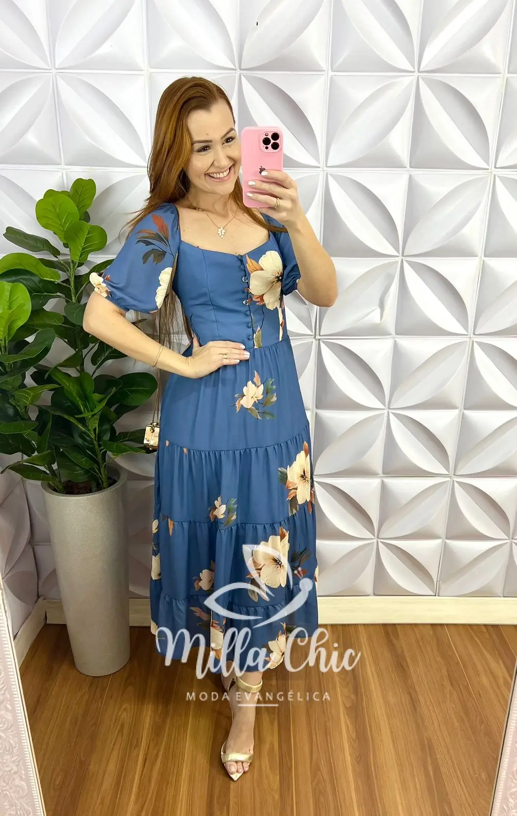 Vestido Chiffon Floral Mídi Com Marias Liana - Azul - Milla Chic