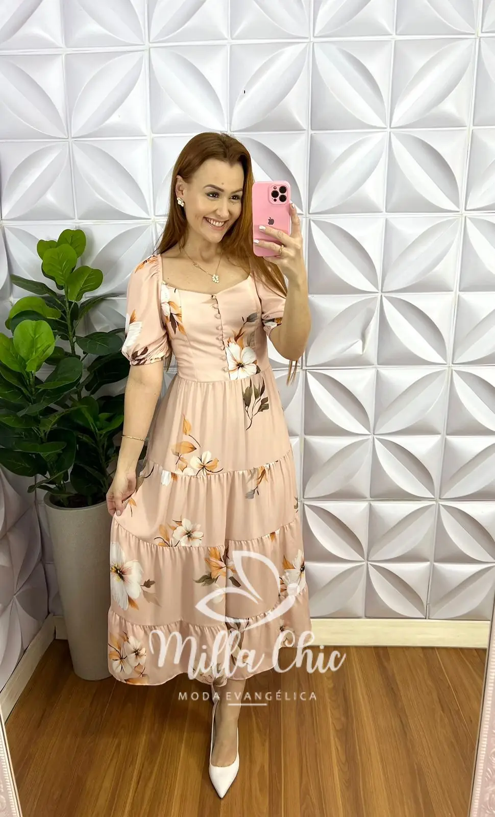 Vestido Chiffon Floral Mídi Com Marias Liana - Rose - Milla Chic