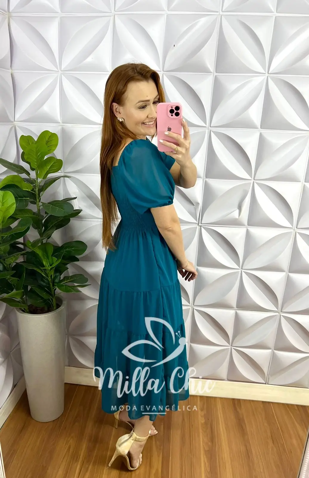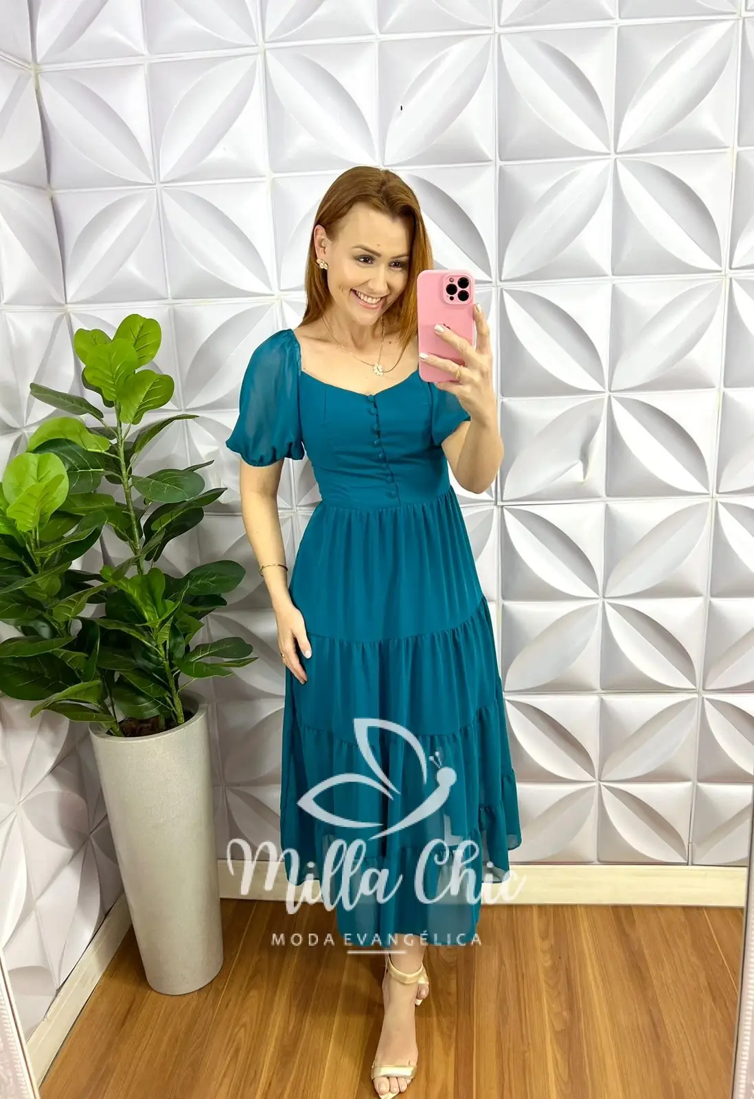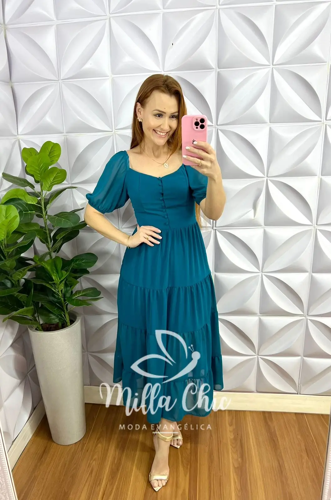 Vestido Chiffon Mídi Com Botões Encapados e Marias Évora - Verde - Milla Chic