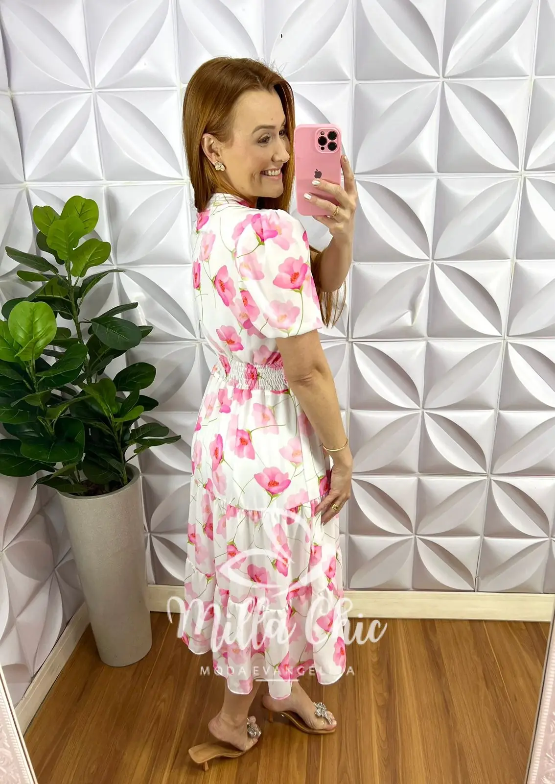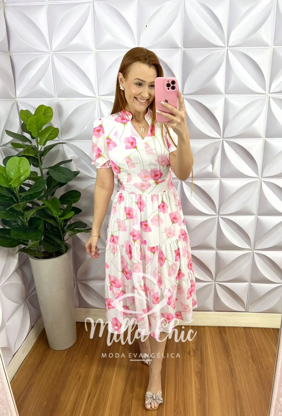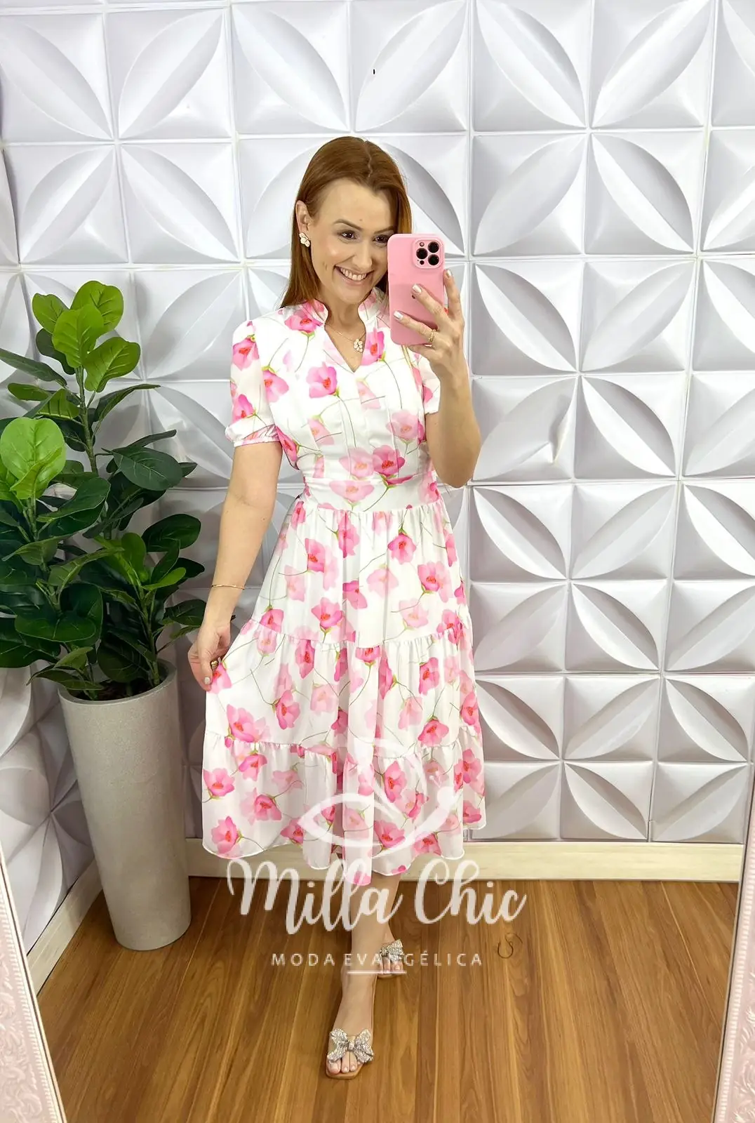 Vestido Chiffon Mídi Estampado Leticia - Branco Com Rosa - Milla Chic