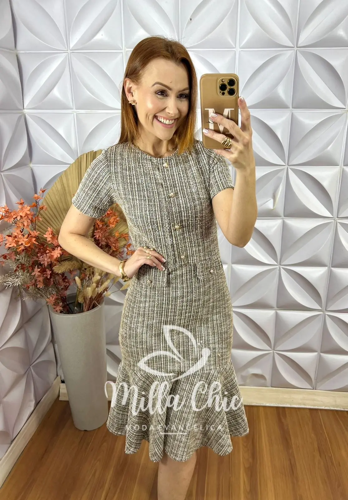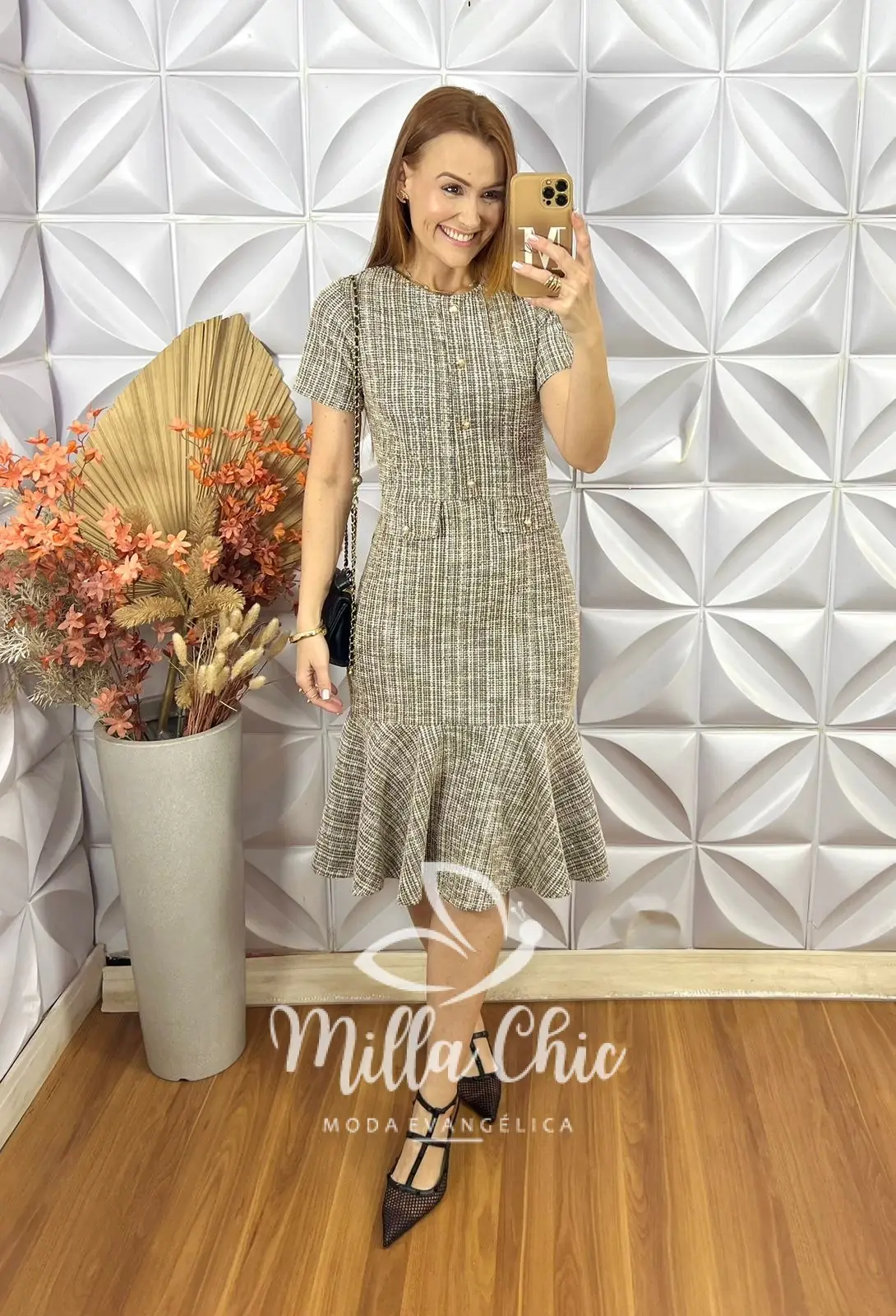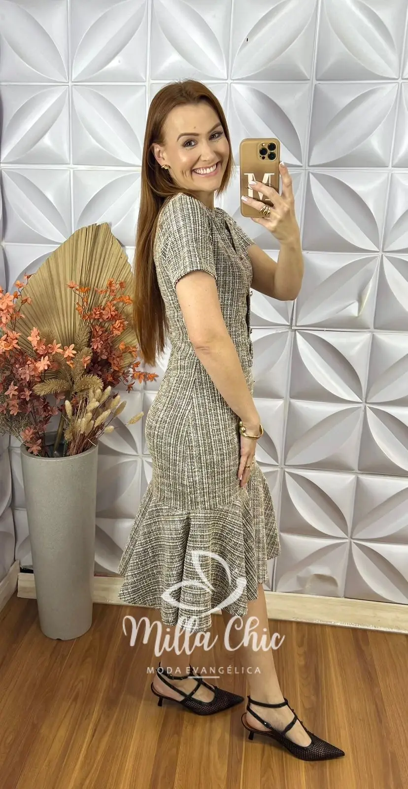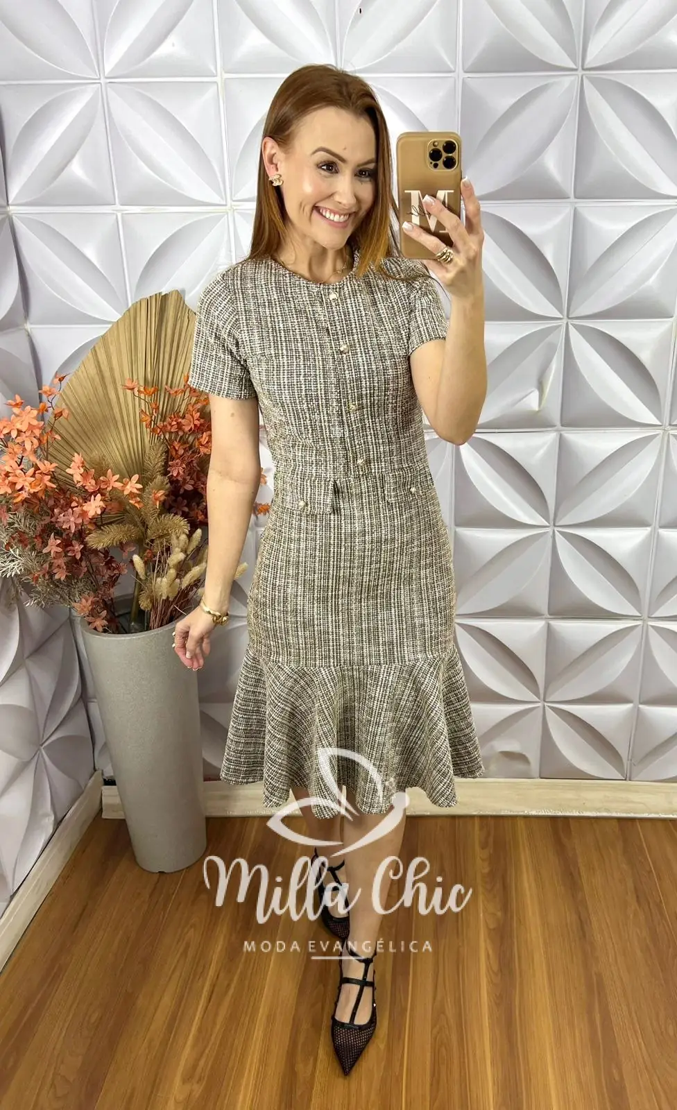 O Vestido Cíntia é feito em tweed com trama diferenciada e padronagem exclusiva trazendo um toque de elegância e sofisticação à peça. Confeccionado em tweed com elastano que proporciona um caimento firme, que mantém a estrutura da peça sem perder o conforto.