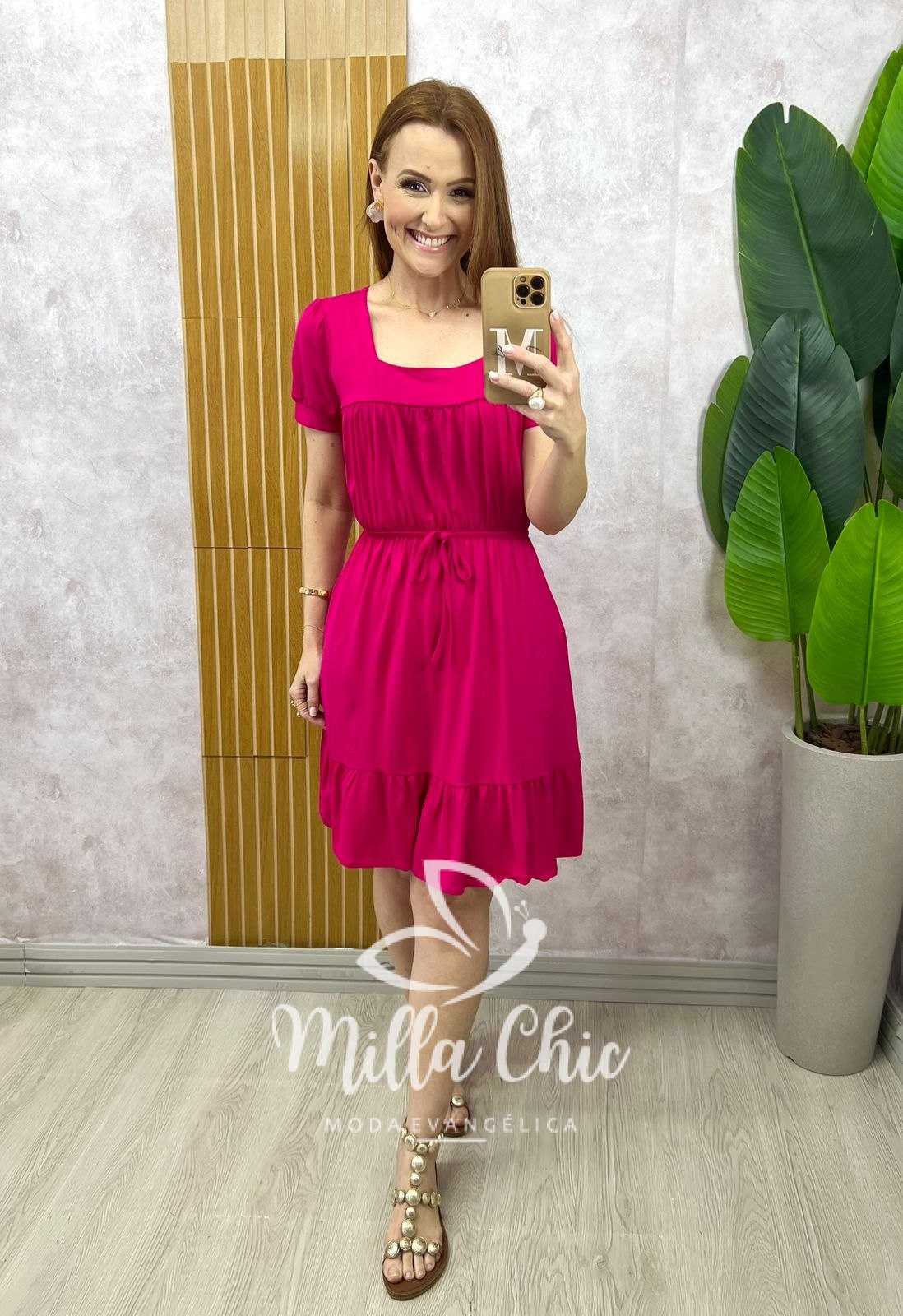 Esse modelo tem o decote quadrado babado na saia e elástico na cintura que deixa ele vestindo super bem. O caimento da saia é solto.