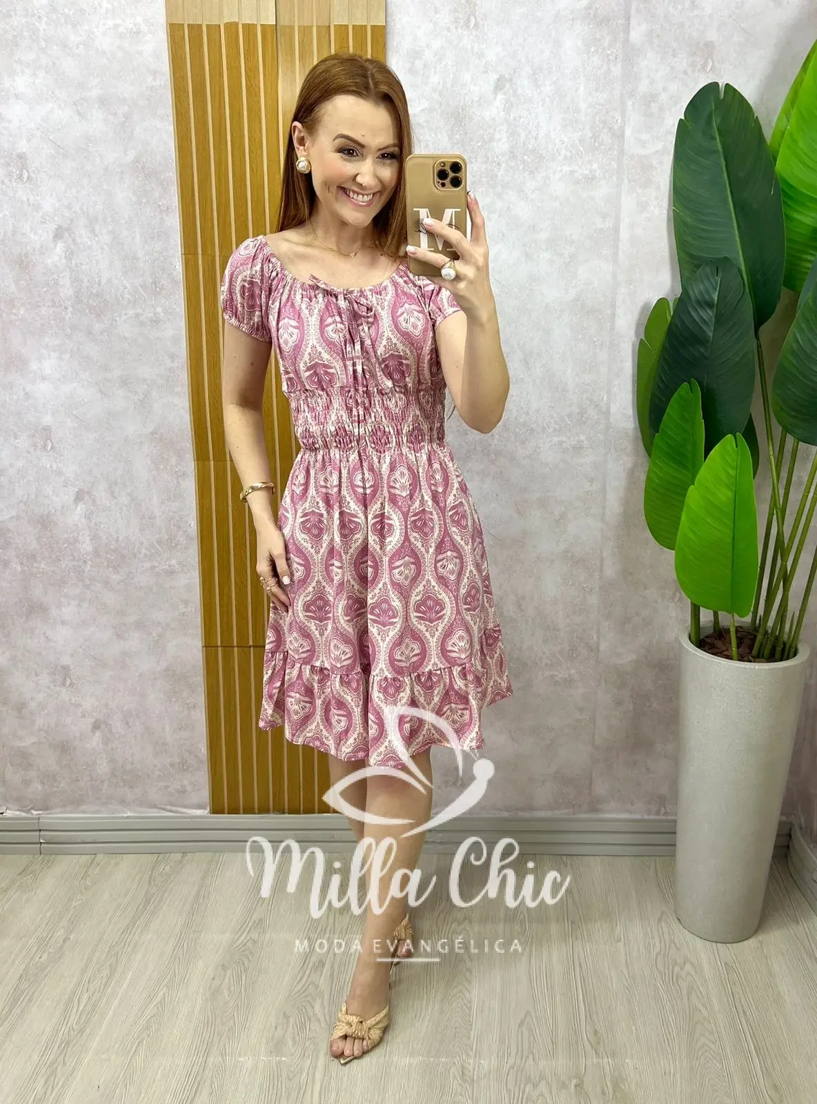 Ele tem a gola ciganinha muito confortável e elástico na cintura que deixa ele vestindo super bem. O caimento da saia é solto…