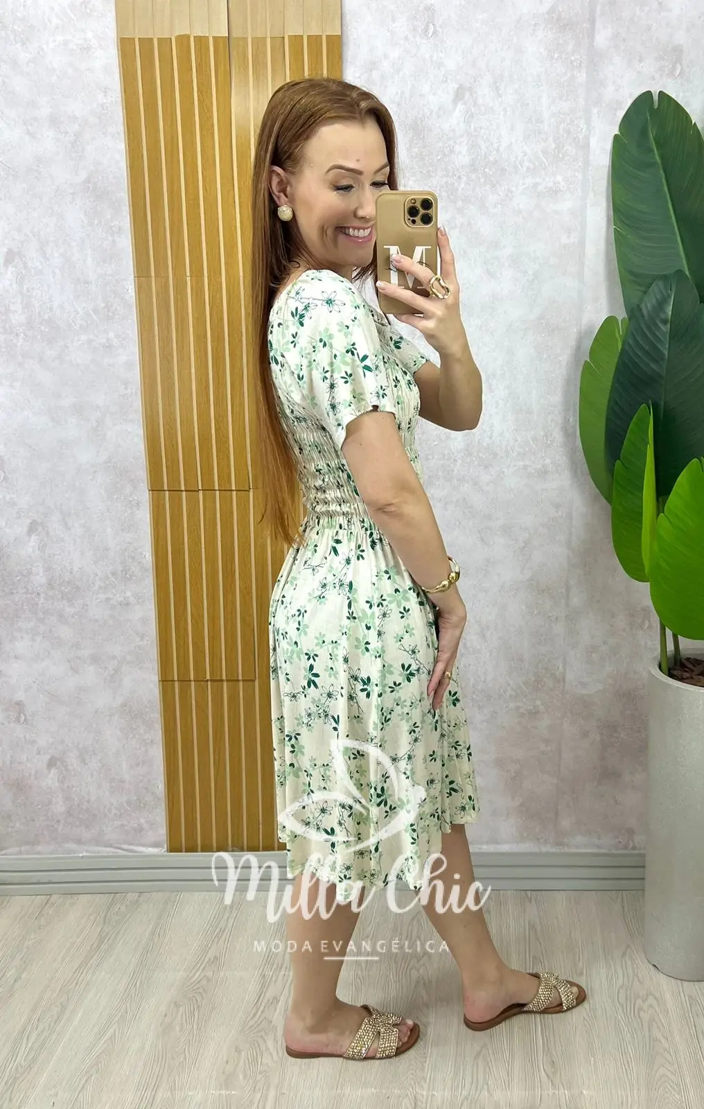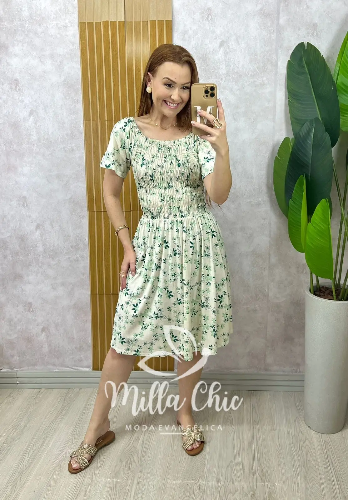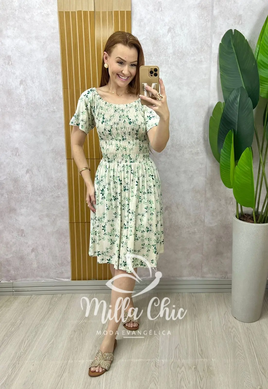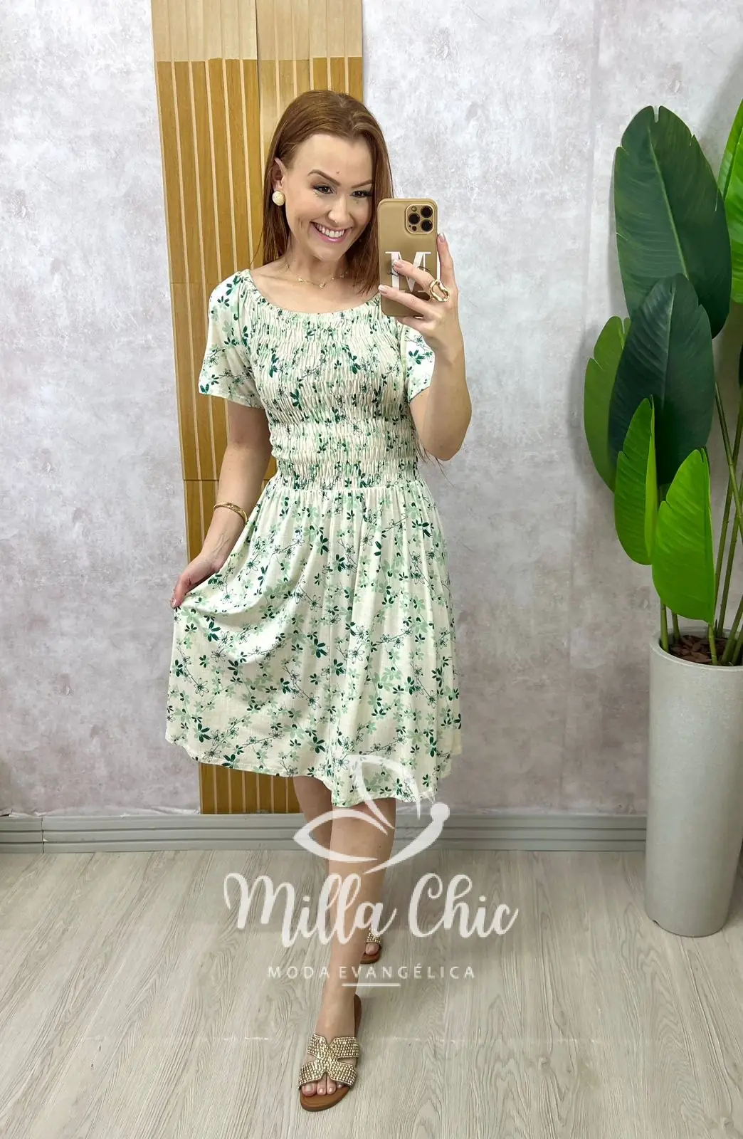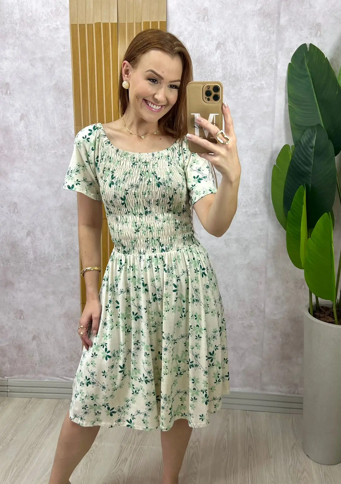 Ele tem a gola ciganinha muito confortável e o elástico em toda a blusa e cintura que deixa ele vestindo super bem demais e dá aquele todo moderno. O caimento da saia é solto… Uma delicia de vestido .