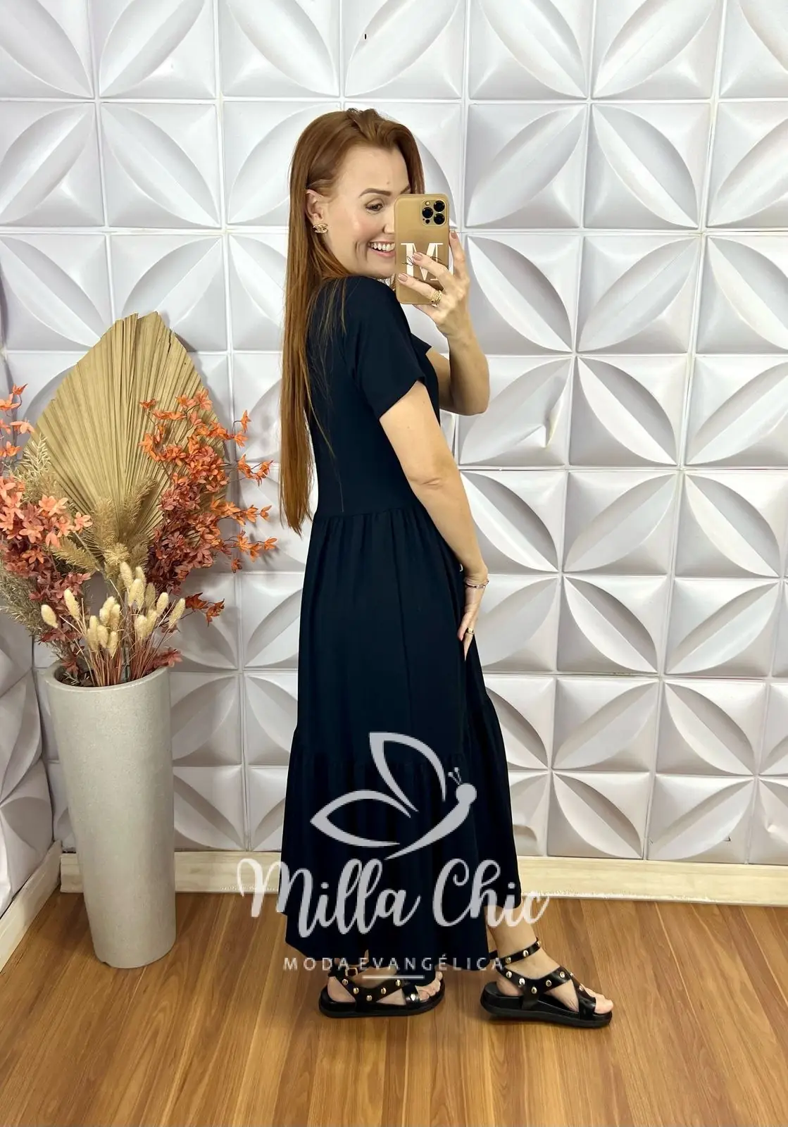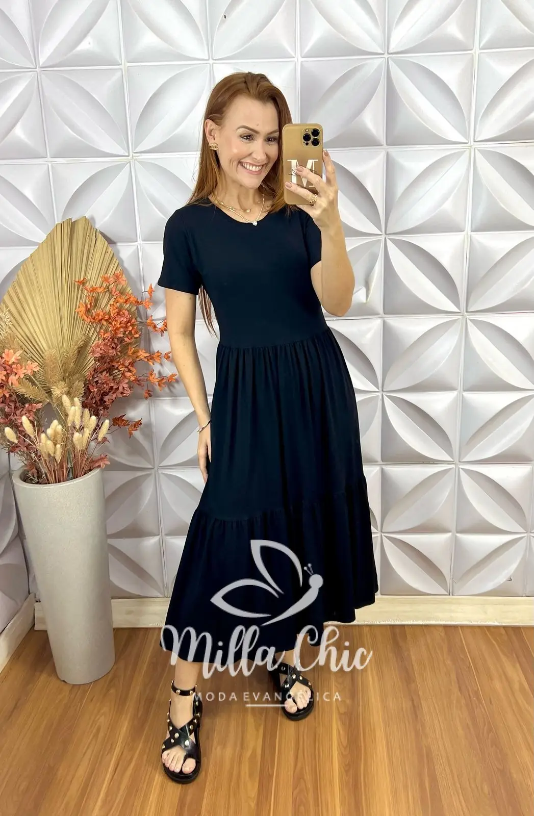 Ele tem a gola redonda muito confortável e a parte da blusa mais reta e o caimento da saia é solto com um babado em marias. Ele é muito estiloso . Com tênis vai ficar lindo também .