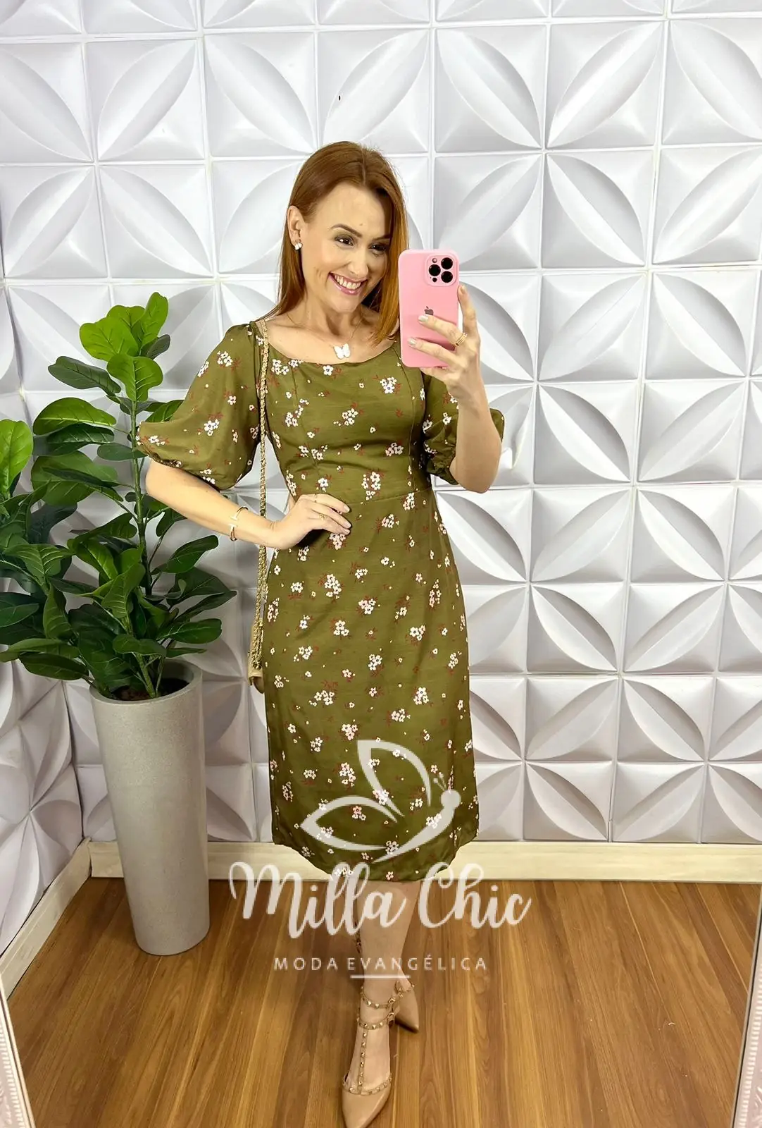 Vestido Crepe Alfaiataria Mídi Com Lastex Estampado Valeria – Verde