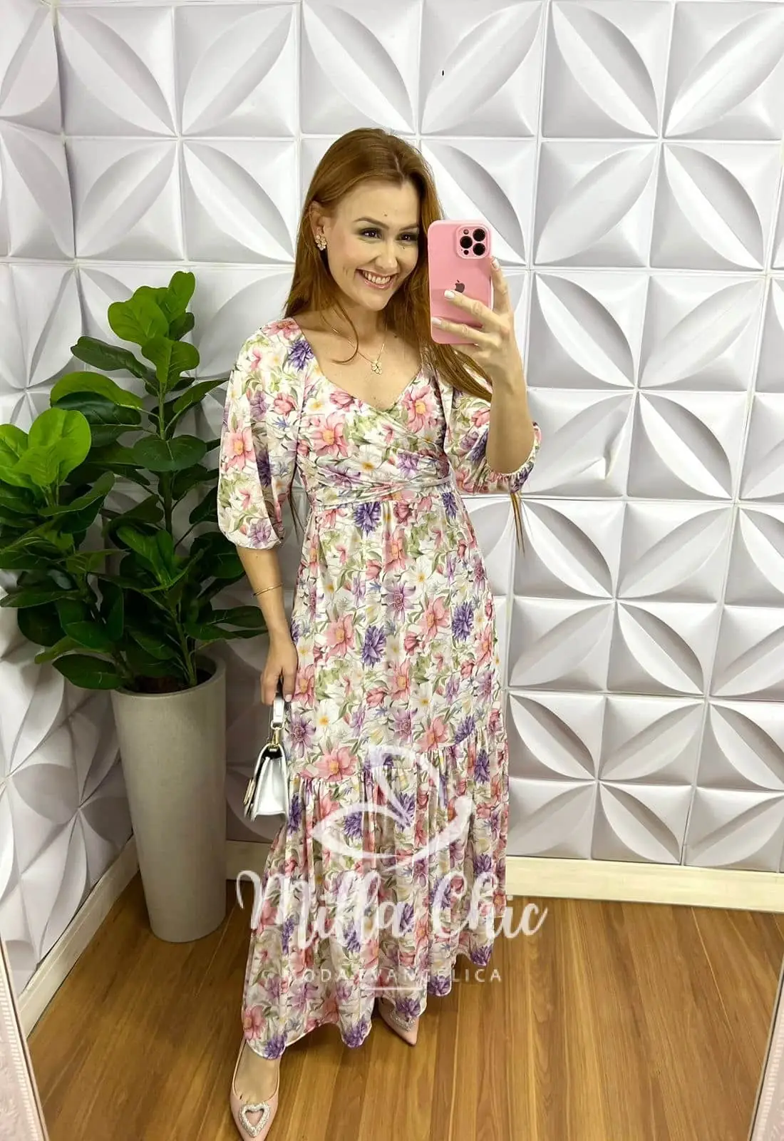 Vestido Crepe De Seda Longo Estampado Lourdes - Floral Branco - Milla Chic