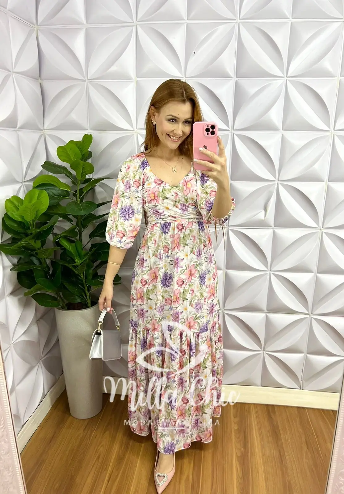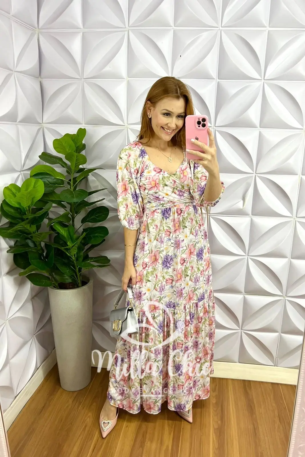 Possui: Decote V, com faixa para envelopar e dar laço nas costas, todo forrado, cintura alta com lastex nas costas para vestir bem, manga 3/4 com elástico na barra, comprimento longo com marias, caimento evase.