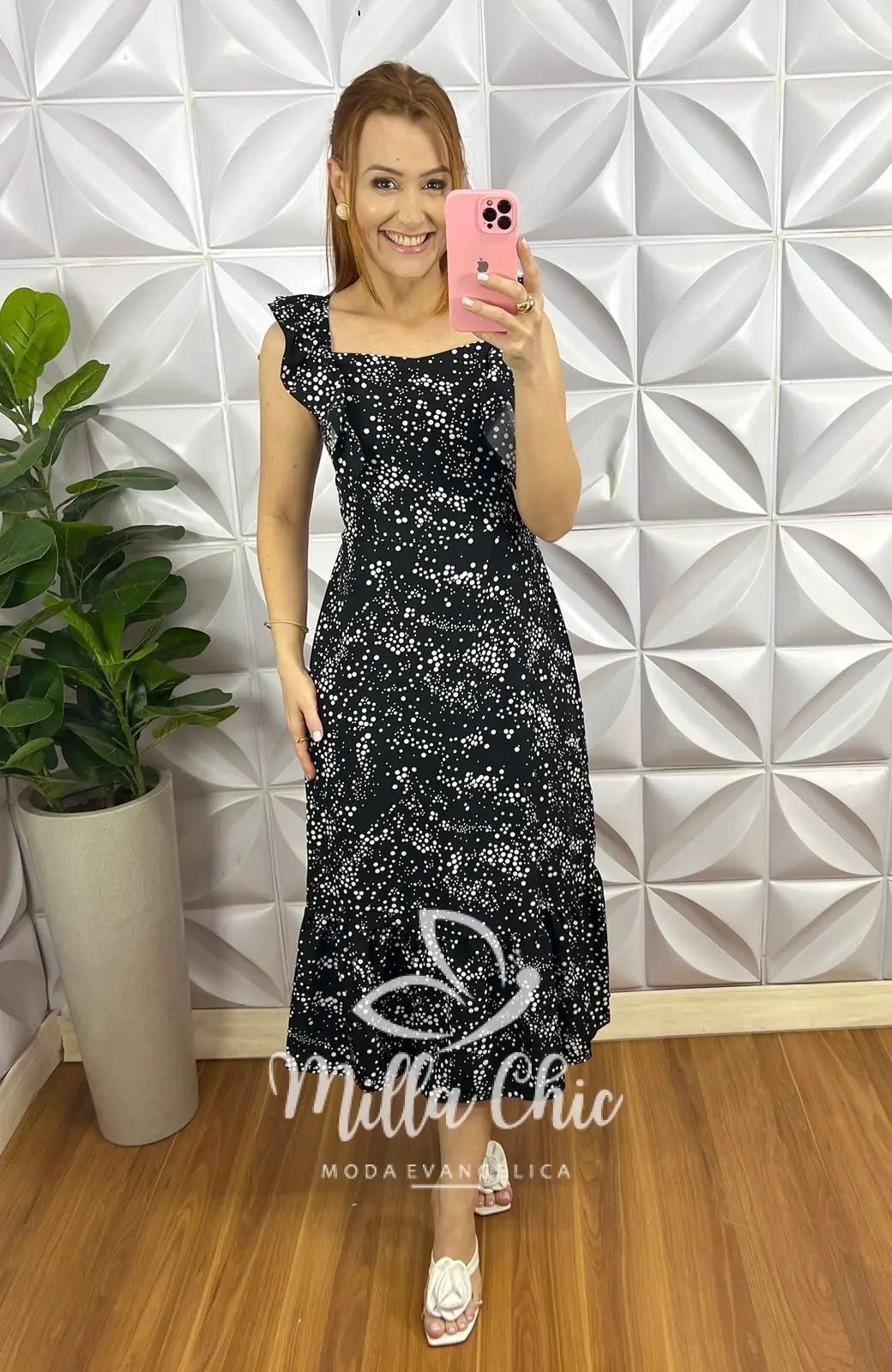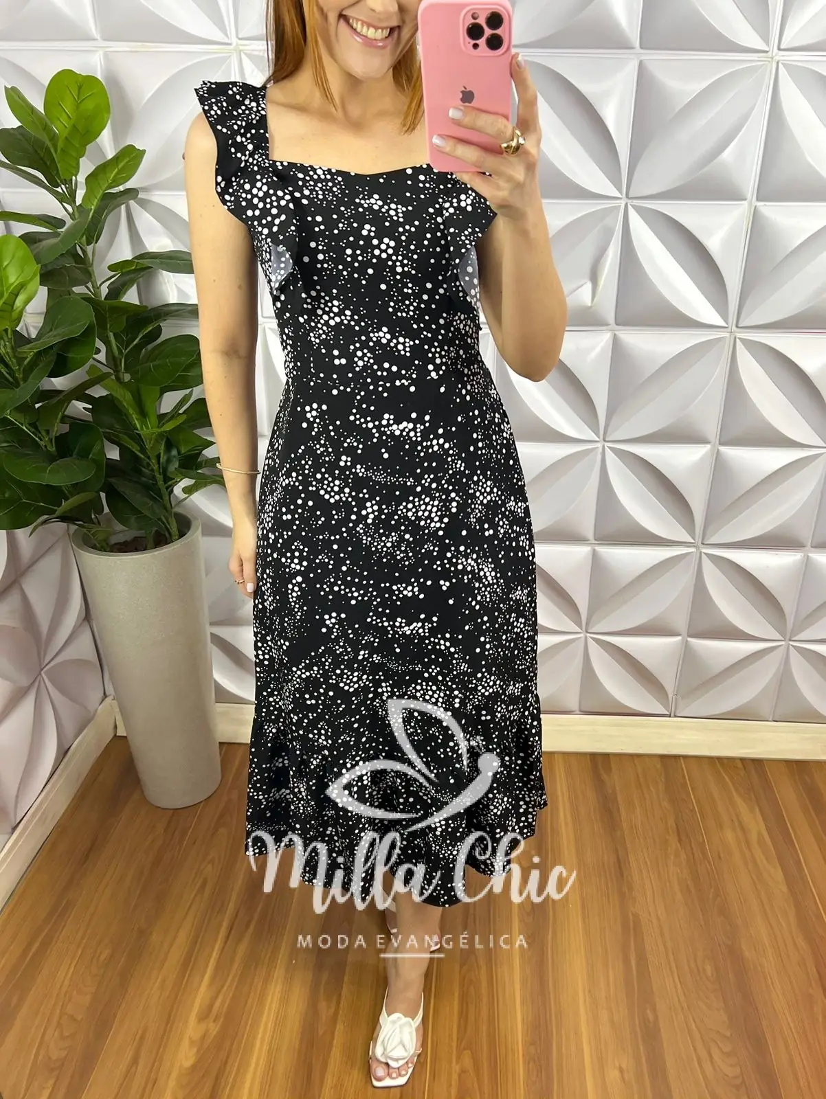 Possui: manga babadinho ate o busto, decote quadrado, cintura marcada, lastex nas costa, comprimento mídi, caimento evase com um babado na barra, forrado na saia.